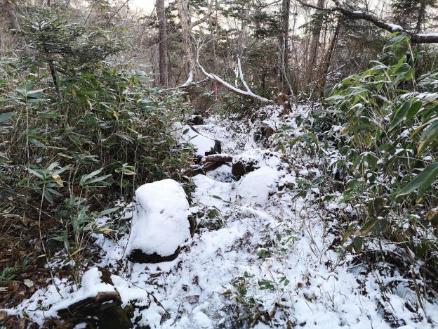 The path continued along the ridge for a while, before turning sharply to the right and down the steep side of the volcano. With more time, it’s possible to descend the opposite side and explore the ponds inside the narrow crater area. However, I was now confronted with a problem other than time: there was a lot more snow than I had expected. I had to proceed carefully to avoid slipping. Luckily the trail zigzagged down and never became too steep. The snow persisted till more than halfway down, and I was relieved when I was finally walking on leaves and dirt again. I reached the end of the trail a couple of hours later, just past 4pm, and less than thirty minutes later I was at Kurohime station, where I caught a local train back to Nagano station. Hopefully I will get to this area next month for some skiing!