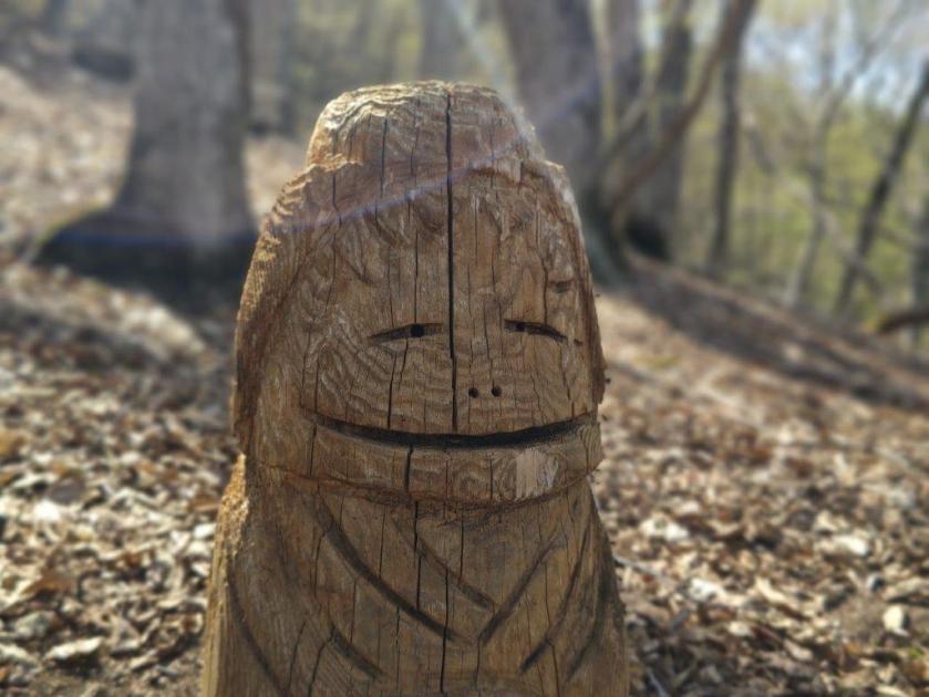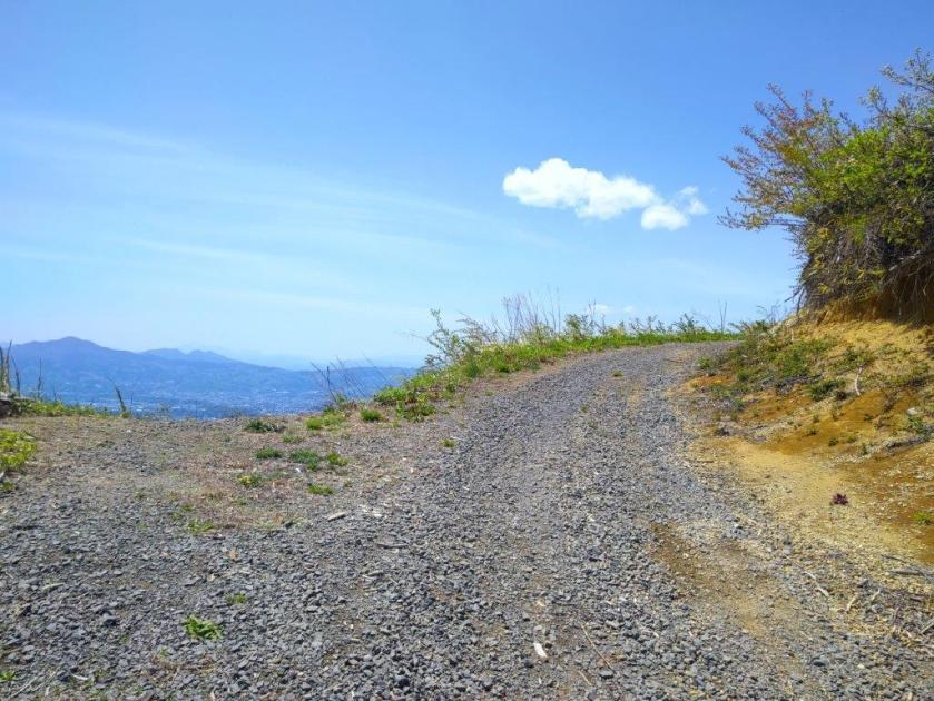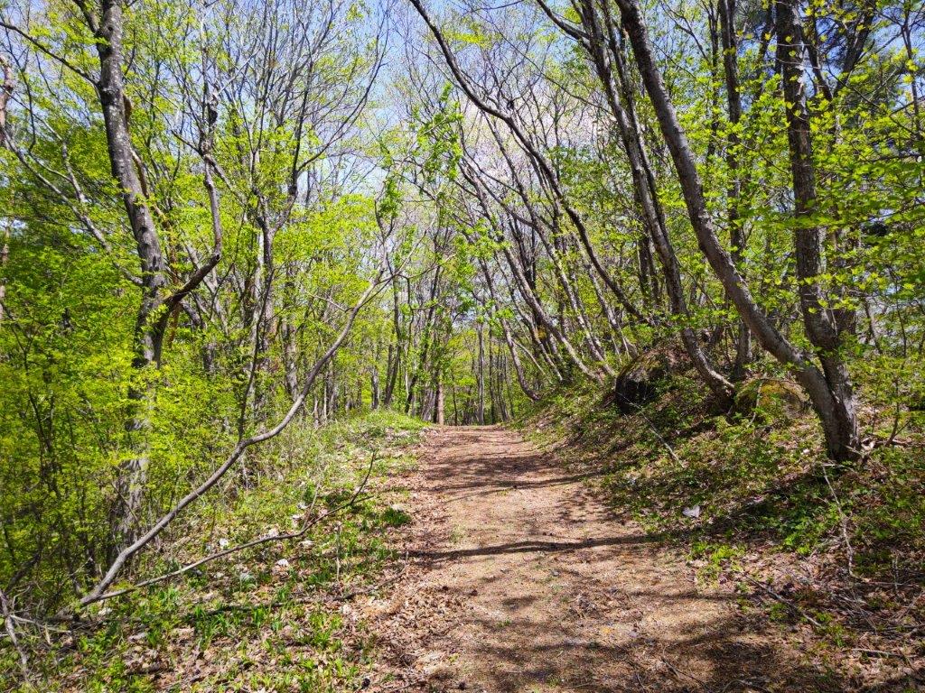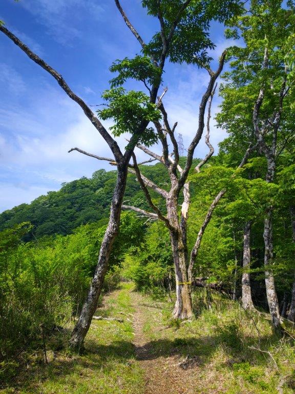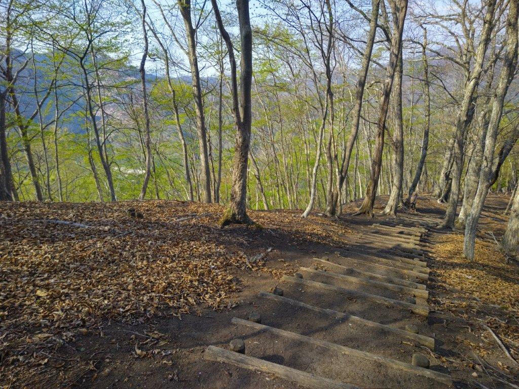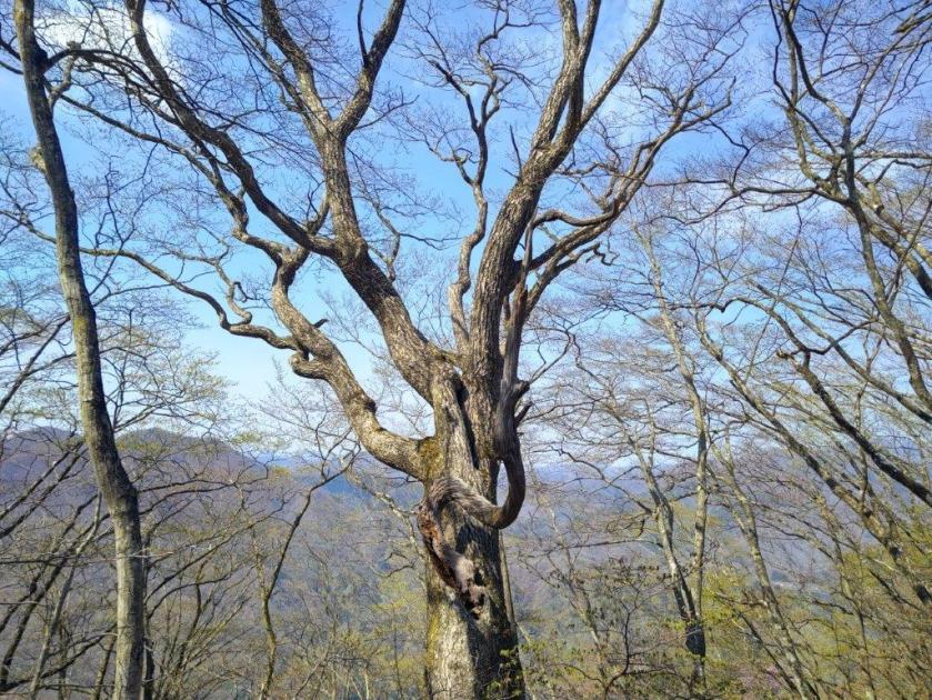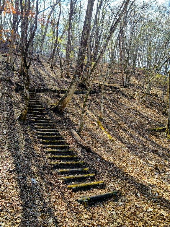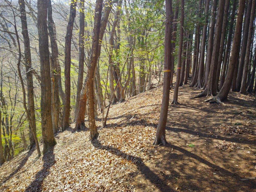 I found myself walking among tall beeches, their tops already bare of leaves, drawing attention to their white trunks. After recrossing the dry riverbed, I reached a paved road where I turned right and soon passed the gated entrance for the road for Fujiyama Twin Terrace, closed to private cars. A little further, I arrived at a sign for today’s mountain, pointing to a faint trail heading up the left side of the dry riverbed. Here, I was glad I could see my position on the Japanwilds digital map since the trail was at times hard to follow. At 1pm, I turned right onto a ridge, the path merging with a signposted trail leading to the summit.
