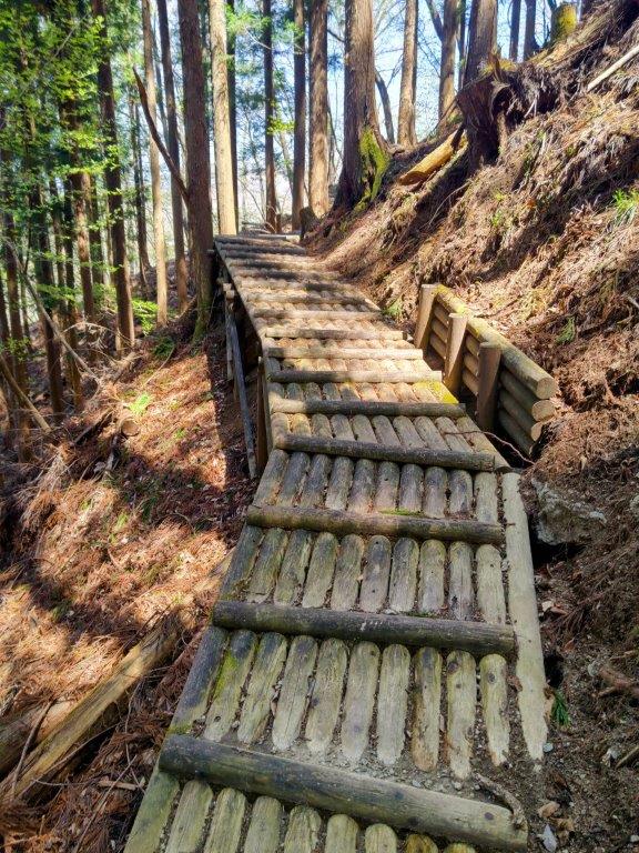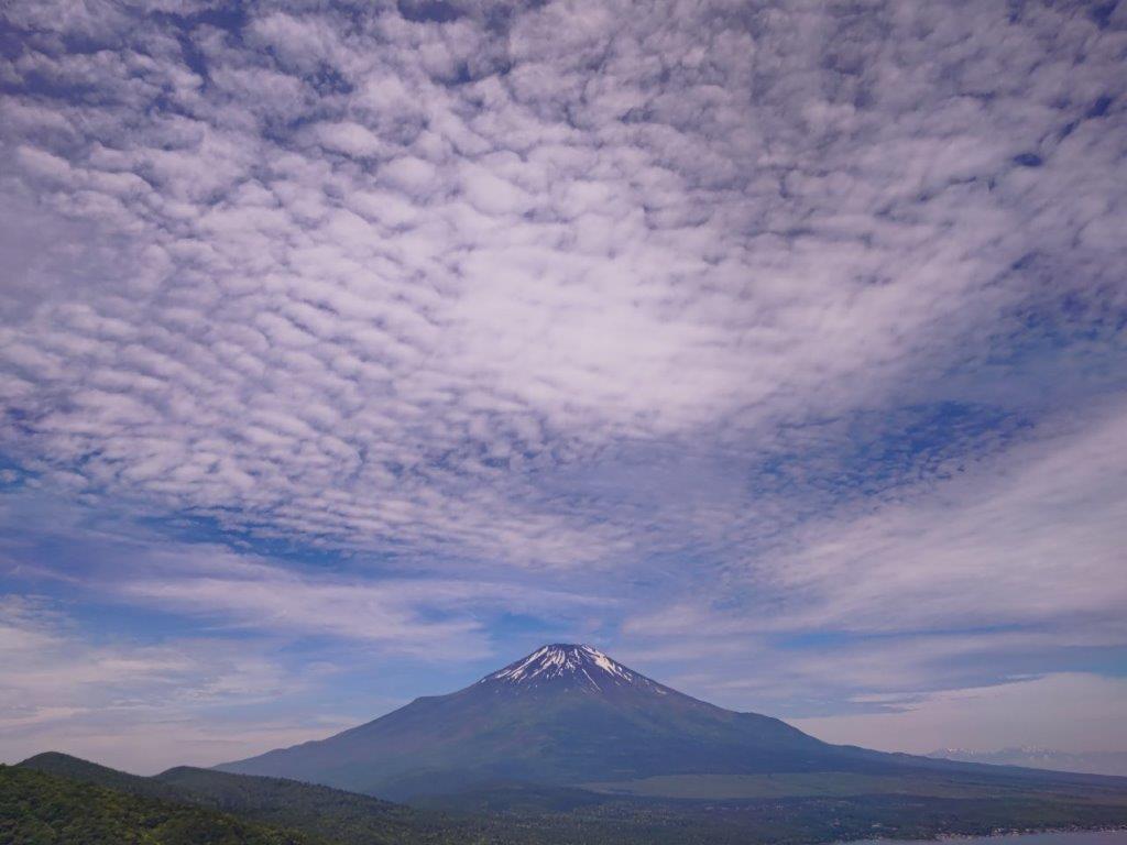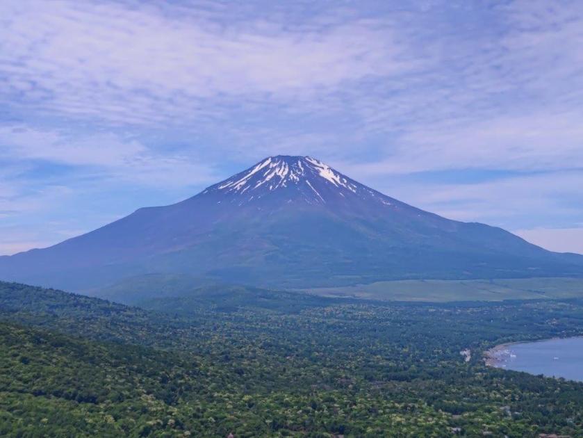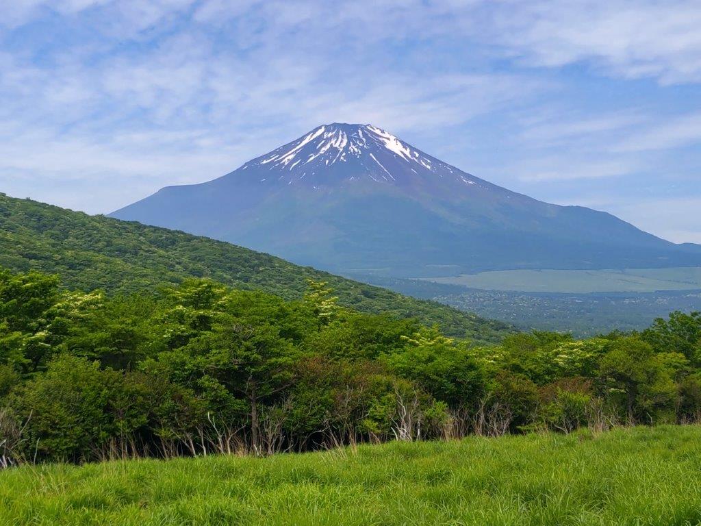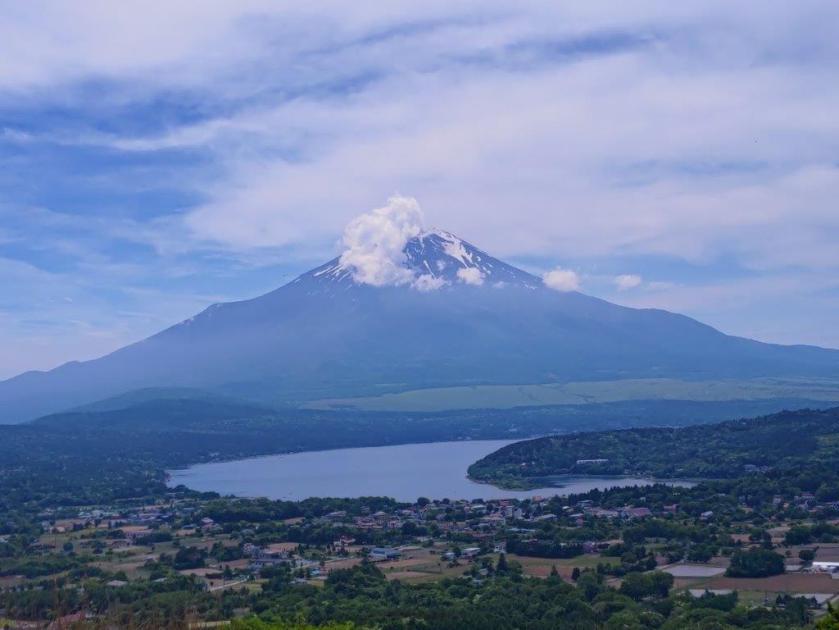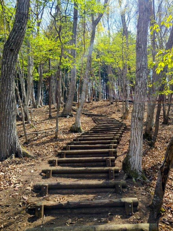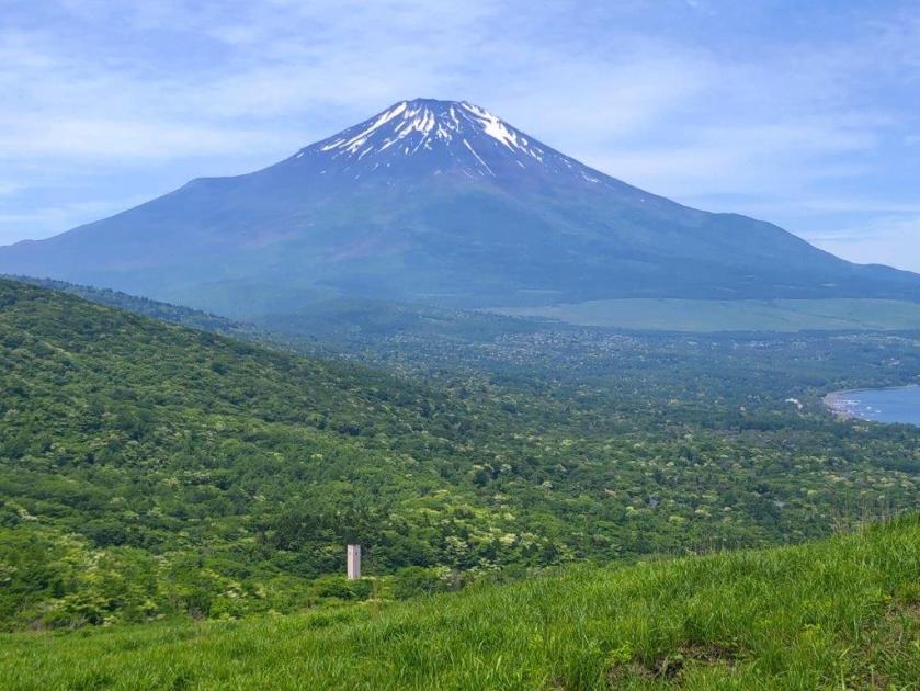 This was the most peaceful and pleasant part of the hike, surrounded by pines masking all sounds and views. I soon passed the summit of Mt Hafu (破風山 はふうざん hafu-zan), only noticeable by its summit marker doubling as a signpost. A short way down the west side was another viewpoint of the Fuji Five Lake area. It was past 2pm so I settled down for a late lunch. Although the clouds were still in, sun rays filtering through the gaps created a magical scenery. At 2h30 I set off again, and soon after passing another viewpoint on the left side, I came upon the first terrace of Fujiyama Twin Terrace at Shindo Pass (新道峠). Opened in July 2021, it was accessible via a short bus ride from the Suzuran Gunseichi parking (a fee is charged each way), and thus was filled with about a dozen sightseers.