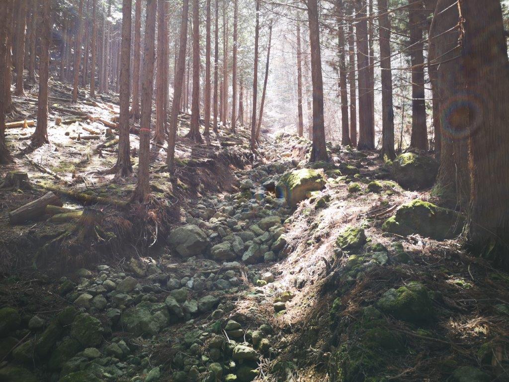 It was a blue sky day as I rode the shinkansen, and then the local train, to Nakanojo. Around 10h30, I boarded a bus for Sawatari Onsen (沢渡温泉), my first time to ride this line. I got off at the last stop, just past the hot spring town, near a bridge over the Sawatori river. Straight ahead, I had a good view of today’s mountain, an isolated peak jutting straight up out of the green forest. As I got ready at the nearby Seseragi Park (せせらぎ公園), I wondered how the trail would get to the top of the rock. At 1130, I set off along a road, and half an hour later, just before another bridge over the river, I turned left onto a forest road.