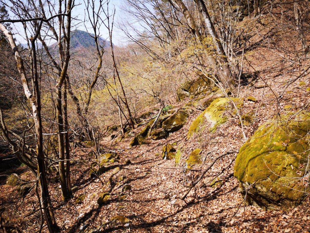 I had also reached the chain and ladder section, called “The Ladder” (梯子); I climbed with care, but near the end I couldn’t advance while keeping three points of contact at all times; after some consideration, I finally found a way, and after fixing it in my mind for the return, continued with the ascent, now in a counter-clockwise direction. A few minutes later, I reached a rocky outcrop from where I had a view south of forested hills. Soon after, I arrived at the flat top of Mt Arikasa (有笠山 ありかさやま arikasayama), a Gunma 100 famous mountain. I couldn’t see anything through the trees, so I headed back almost at once; I got down “The Ladder” safely, and since it was 1h30, found a good place to sit for lunch, at a safe distance from the cliff edge. Afterwards, I continued along the trail, now heading downhill towards the East entrance.