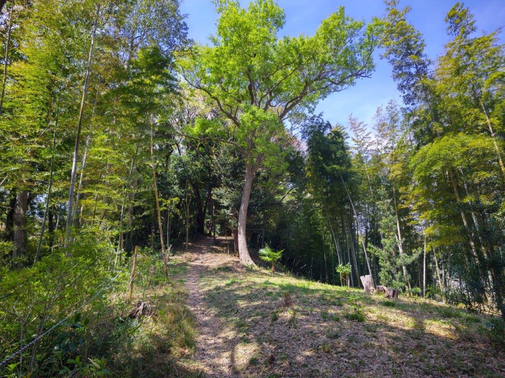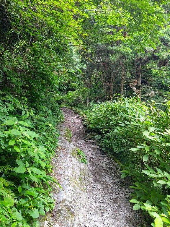 Fortunately this section was in the shade and a small brook running parallel to the road also had, I hoped, a cooling effect; here and there tall birches reached upwards, reminding me I was now inside the Meiji no Mori Takao Quasi-National Park. I soon reached a series of stone steps leading to a small Inari shrine near Jataki Falls (蛇滝 meaning “snake waterfall”). I was unable to spot the falls, most likely hidden by the mountain side and seemingly off limits to hikers. On the other hand, it seemed like a peaceful spot off the beaten trail, lush vegetation crowding in from all sides. Around now, I was starting to feel the effect of the heat so I soon continued on my way, slowly following the switchback trail up the north side of the mountain.