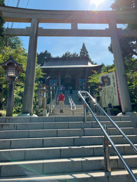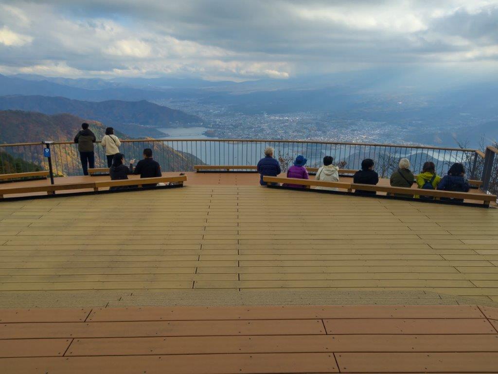 This was the most peaceful and pleasant part of the hike, surrounded by pines masking all sounds and views. I soon passed the summit of Mt Hafu (破風山 はふうざん hafu-zan), only noticeable by its summit marker doubling as a signpost. A short way down the west side was another viewpoint of the Fuji Five Lake area. It was past 2pm so I settled down for a late lunch. Although the clouds were still in, sun rays filtering through the gaps created a magical scenery. At 2h30 I set off again, and soon after passing another viewpoint on the left side, I came upon the first terrace of Fujiyama Twin Terrace at Shindo Pass (新道峠). Opened in July 2021, it was accessible via a short bus ride from the Suzuran Gunseichi parking (a fee is charged each way), and thus was filled with about a dozen sightseers.
