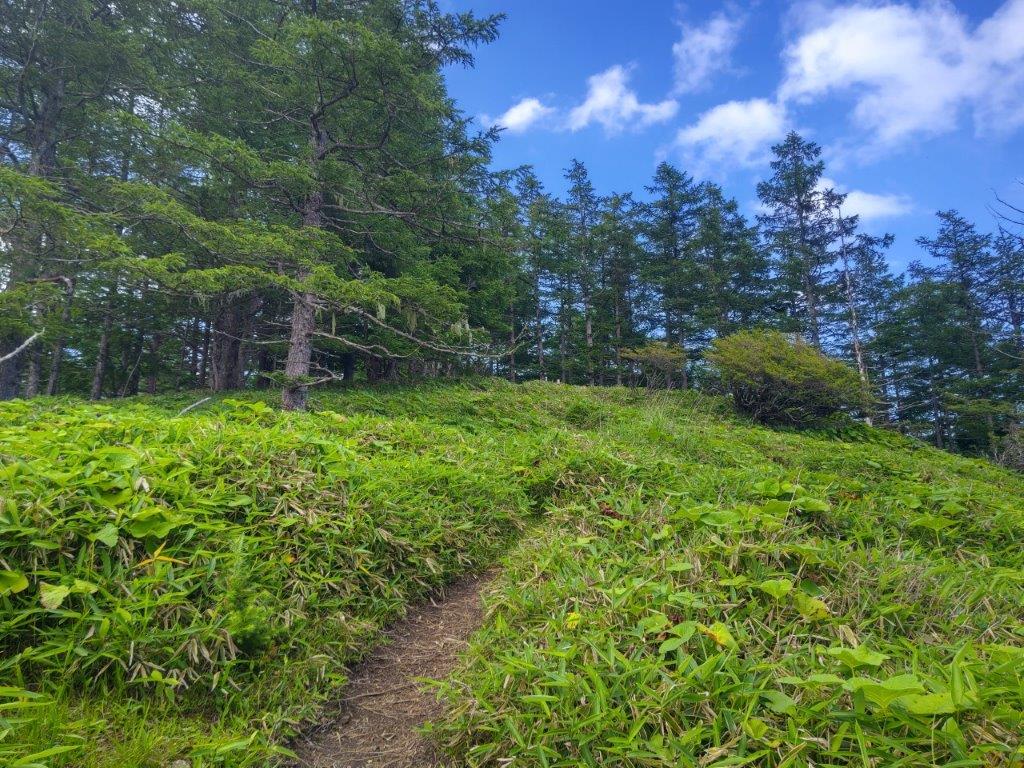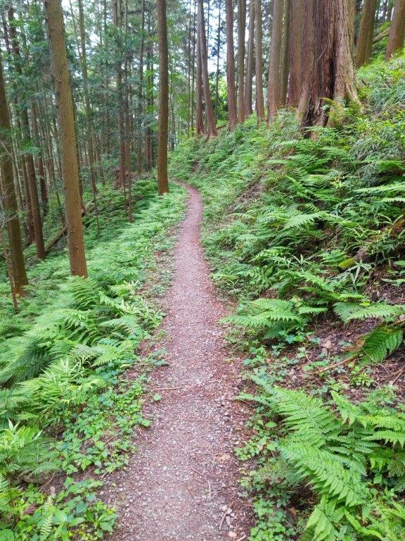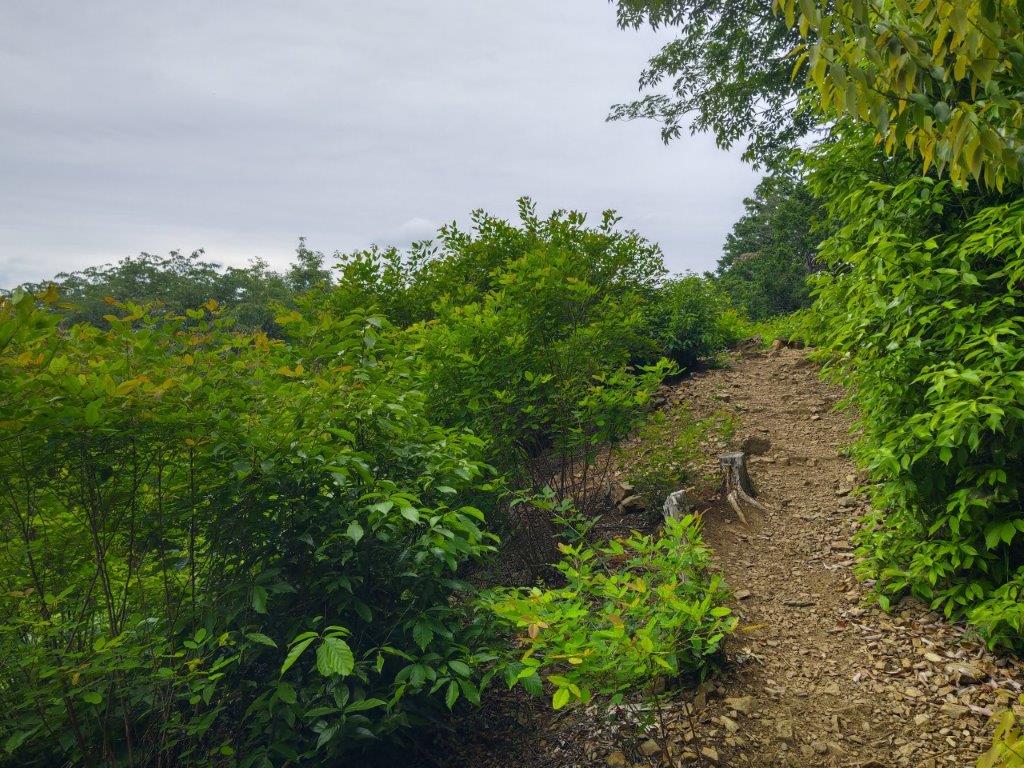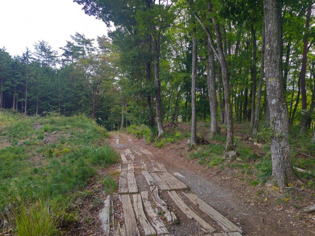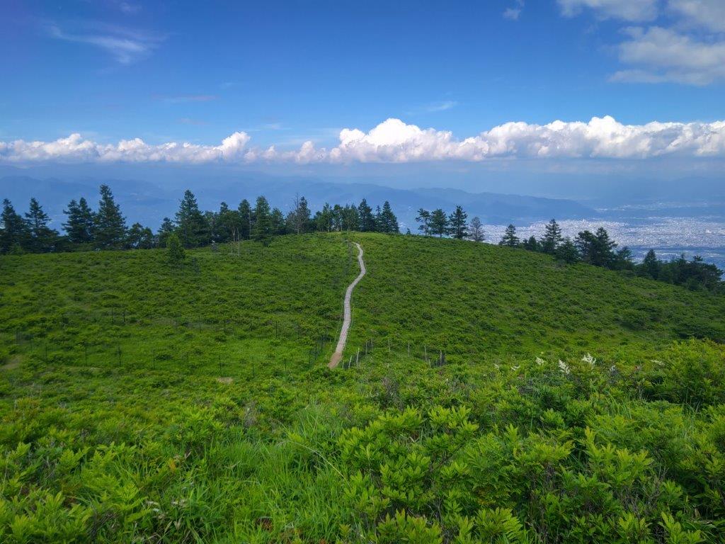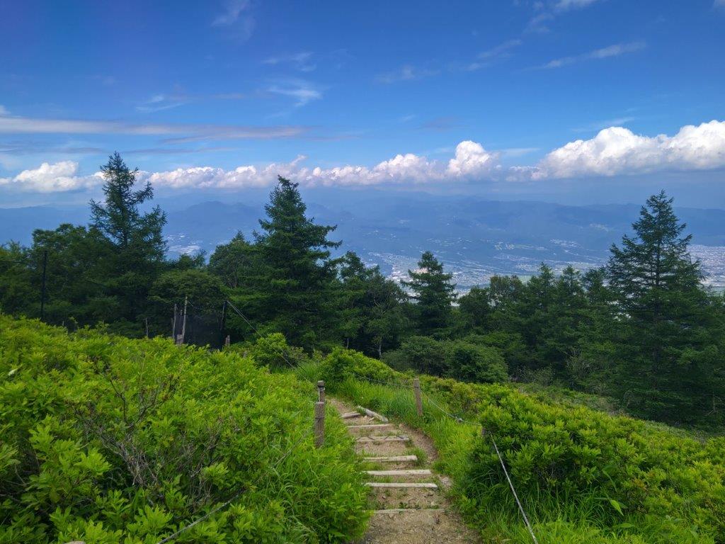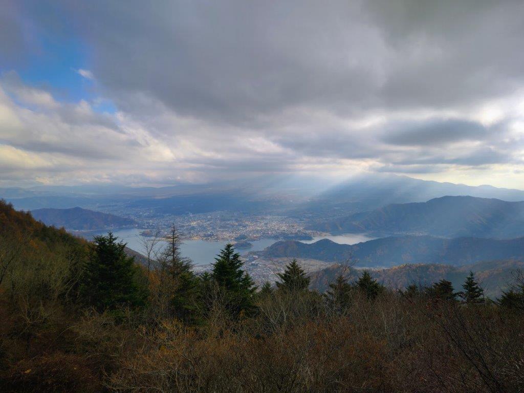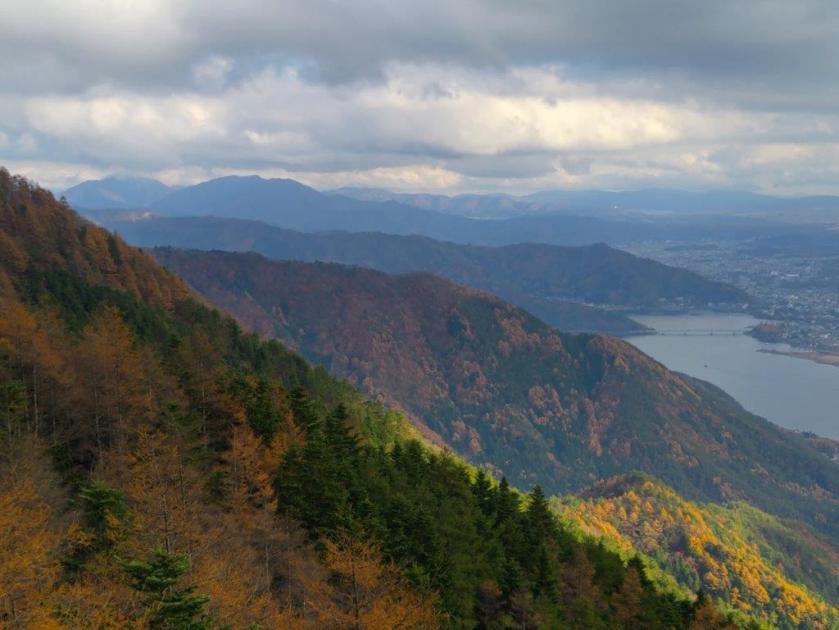 I was surprised to see that thick clouds had rolled in during my ascent, completely hiding Mt Fuji from view. According to the other hikers, I had missed Japan’s iconic volcano by only a few minutes. Looking down, I still had a view of Kawaguchiko lake extending east to west along the base of the mountains. On the right side, I could see Mt Ou and Mt Setto, two other main peaks of the Misaka mountains. I decided to skip my planned lunch break and immediately head to the next summit, in hope that the clouds would have cleared by then. I retraced by steps and headed down a steep path on the west side; beyond Suzuran Pass (すずらん峠), the path became level and easy to walk.