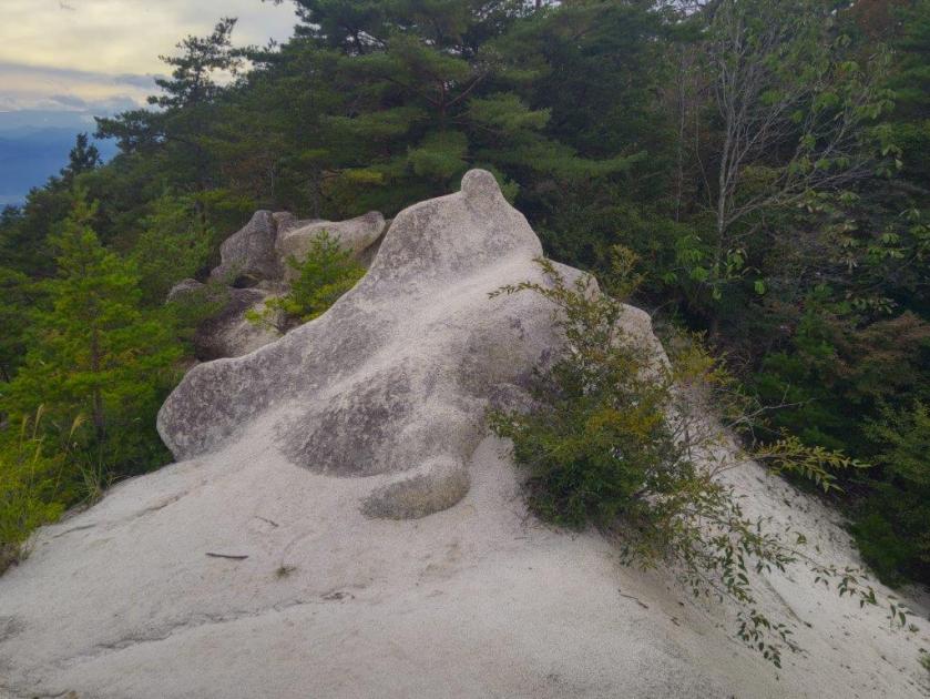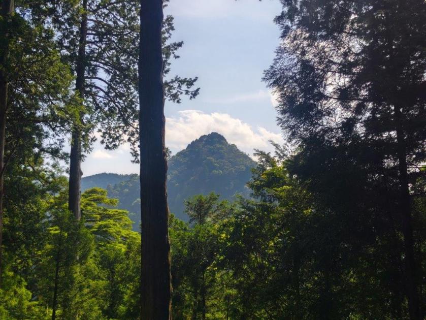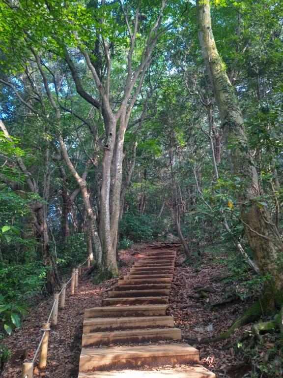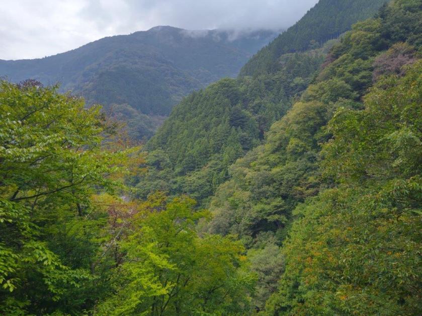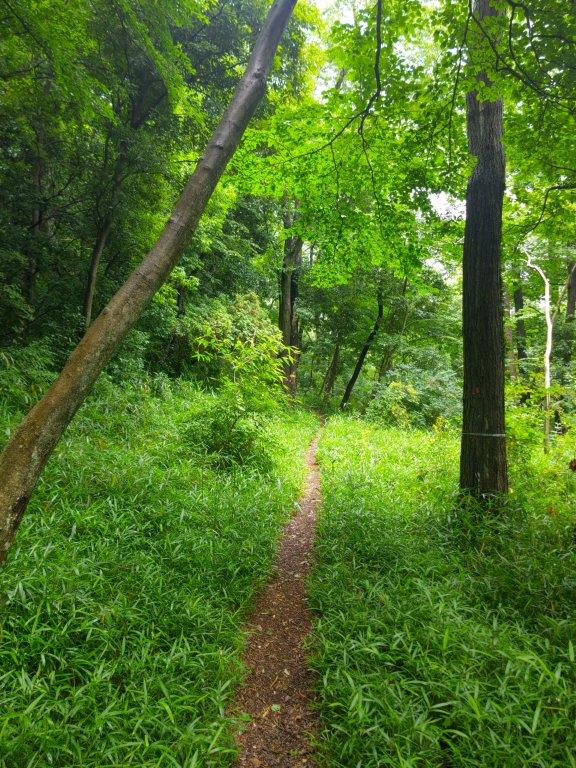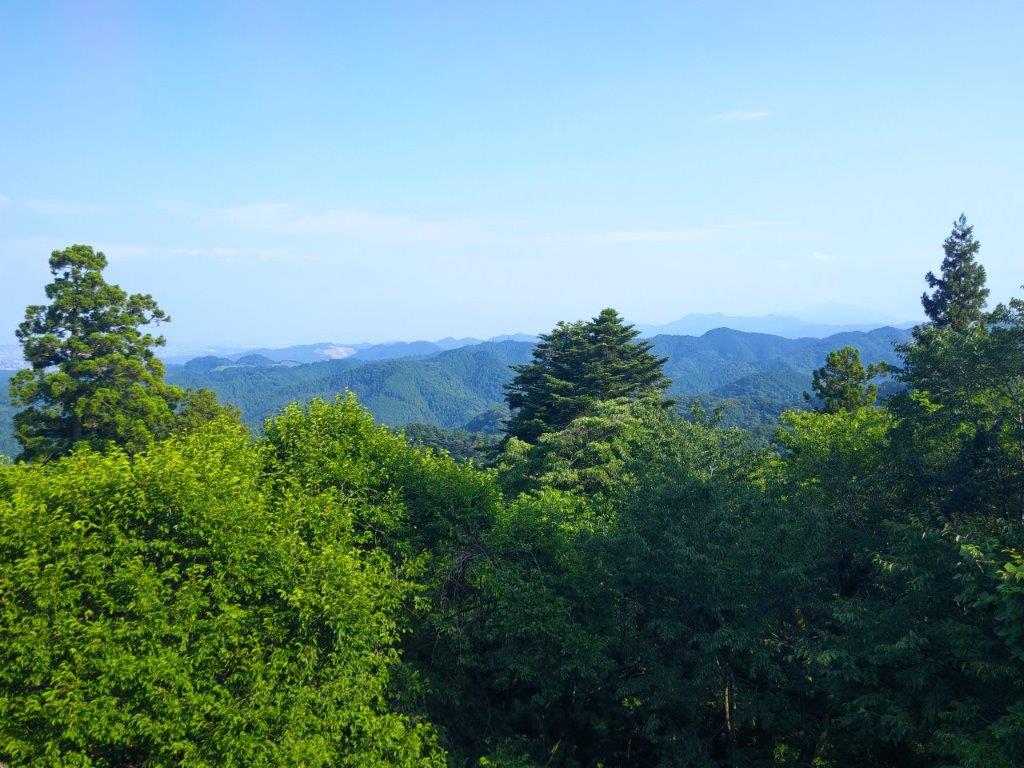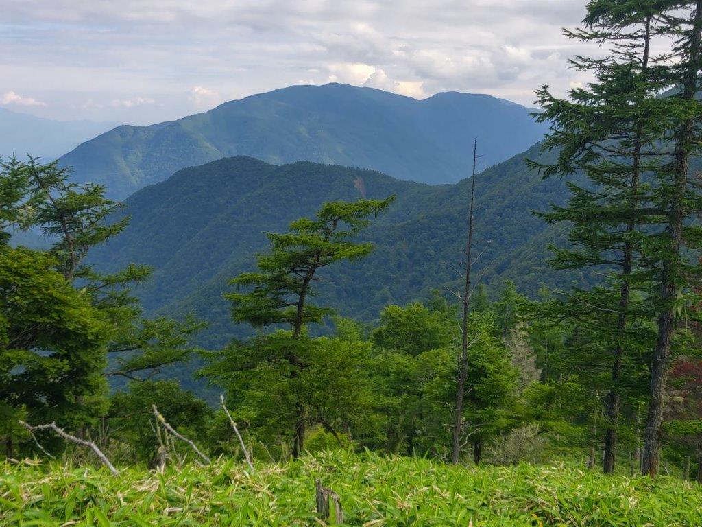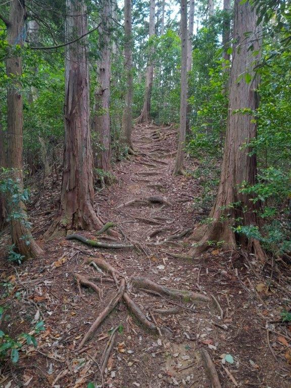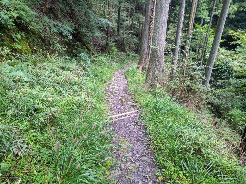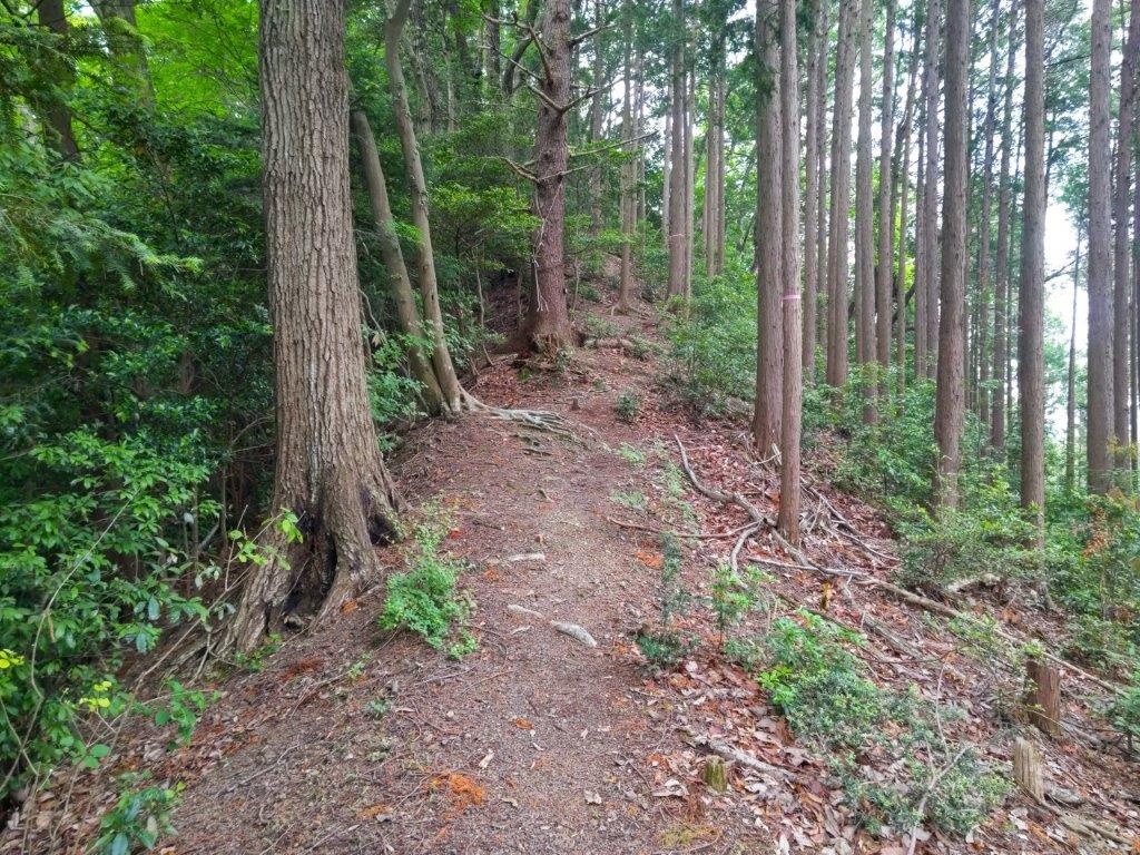 I was surprised to see that thick clouds had rolled in during my ascent, completely hiding Mt Fuji from view. According to the other hikers, I had missed Japan’s iconic volcano by only a few minutes. Looking down, I still had a view of Kawaguchiko lake extending east to west along the base of the mountains. On the right side, I could see Mt Ou and Mt Setto, two other main peaks of the Misaka mountains. I decided to skip my planned lunch break and immediately head to the next summit, in hope that the clouds would have cleared by then. I retraced by steps and headed down a steep path on the west side; beyond Suzuran Pass (すずらん峠), the path became level and easy to walk.
