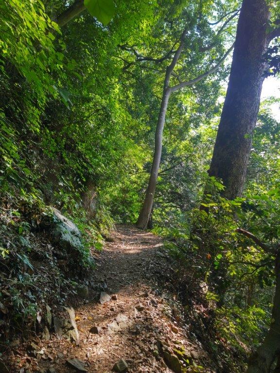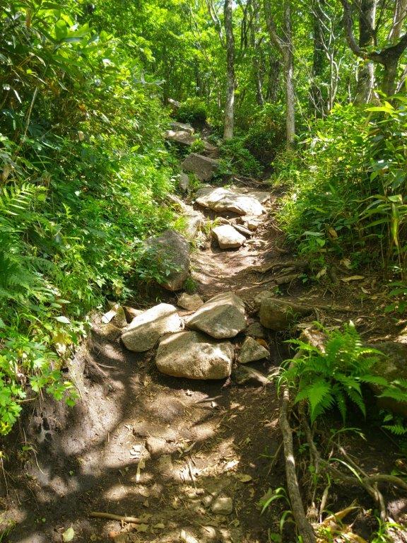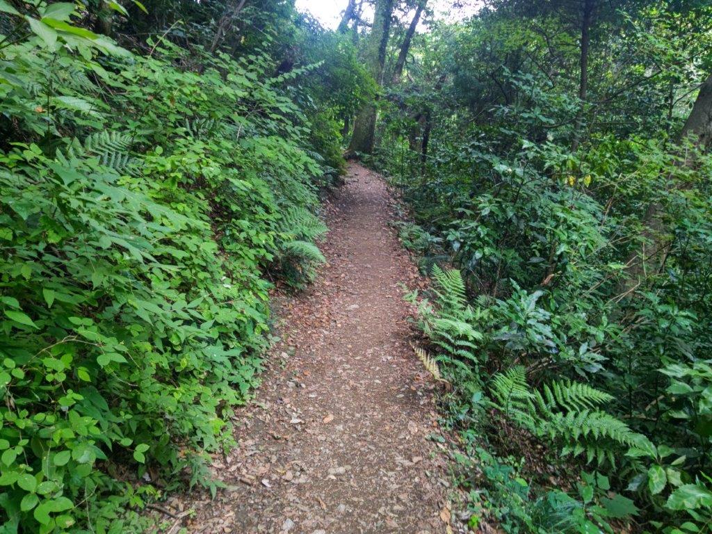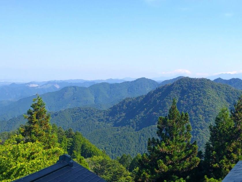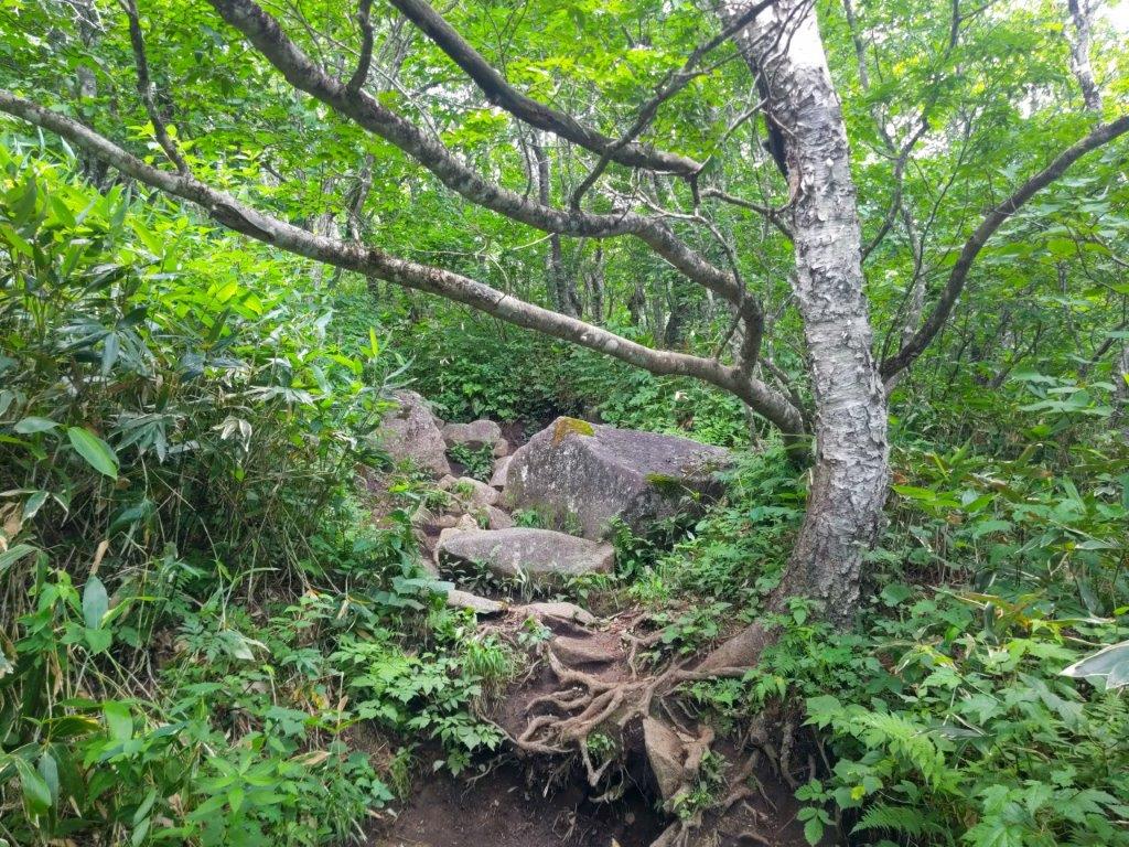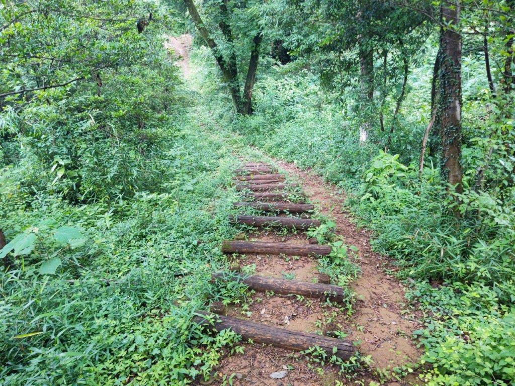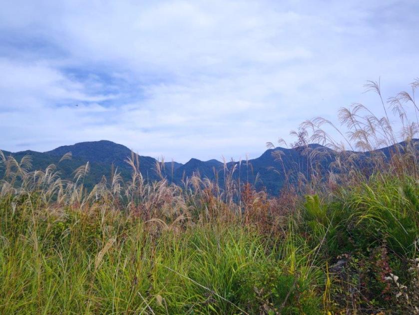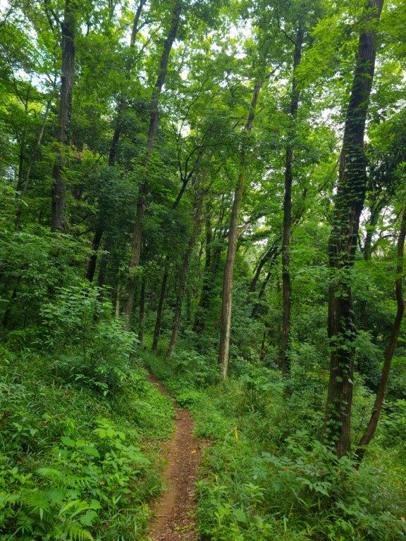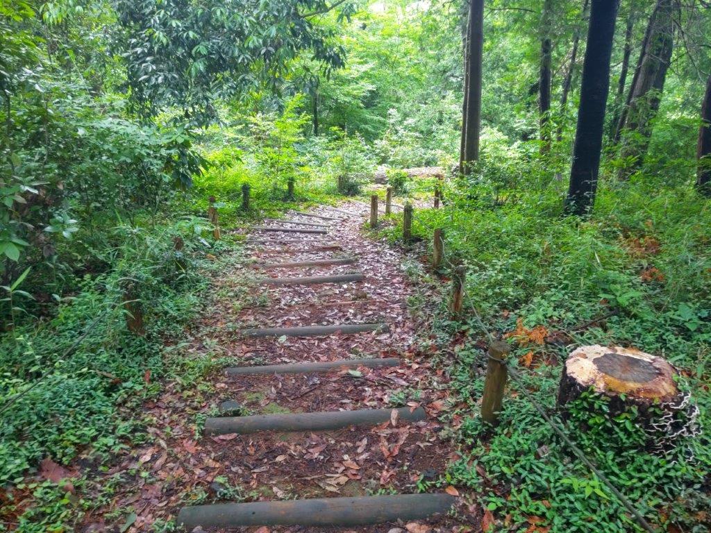 I was surprised to see that thick clouds had rolled in during my ascent, completely hiding Mt Fuji from view. According to the other hikers, I had missed Japan’s iconic volcano by only a few minutes. Looking down, I still had a view of Kawaguchiko lake extending east to west along the base of the mountains. On the right side, I could see Mt Ou and Mt Setto, two other main peaks of the Misaka mountains. I decided to skip my planned lunch break and immediately head to the next summit, in hope that the clouds would have cleared by then. I retraced by steps and headed down a steep path on the west side; beyond Suzuran Pass (すずらん峠), the path became level and easy to walk.