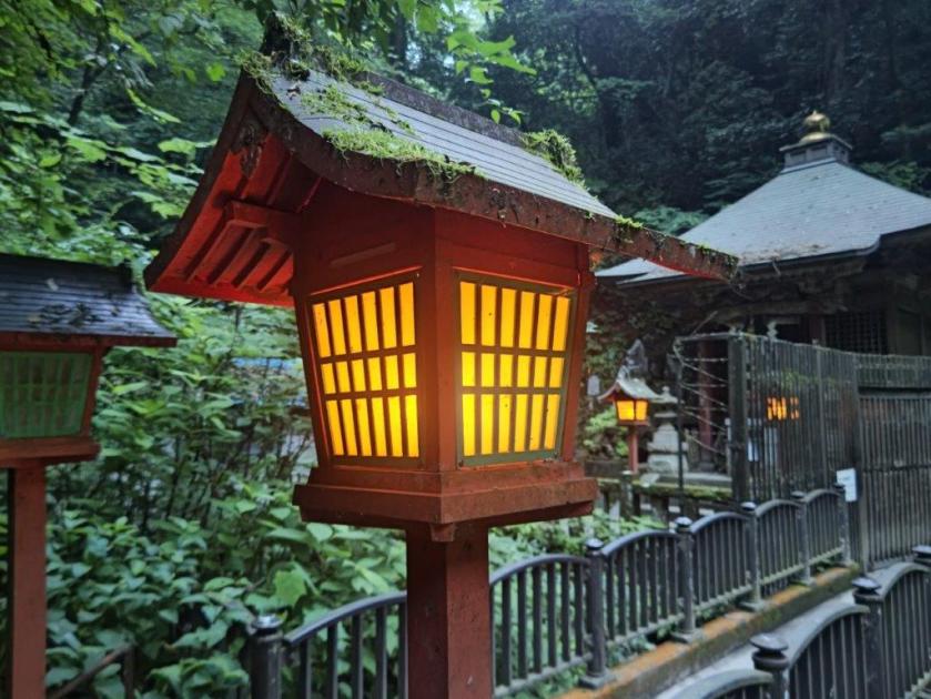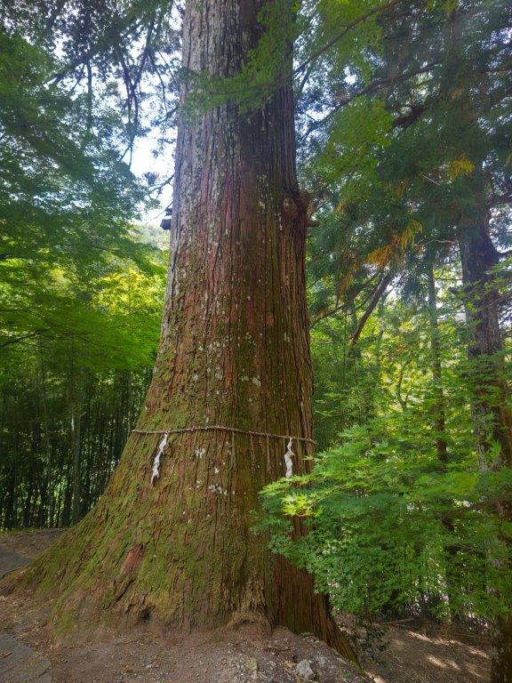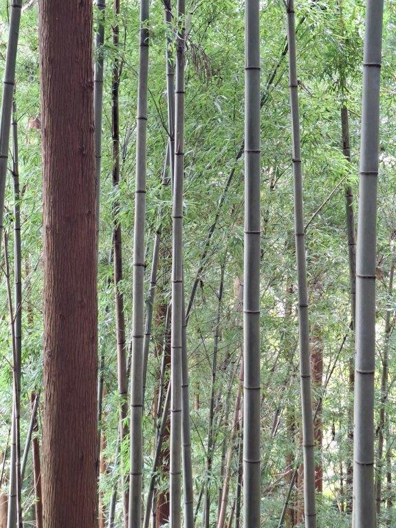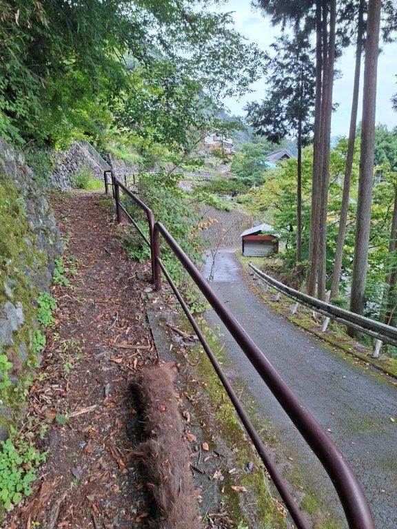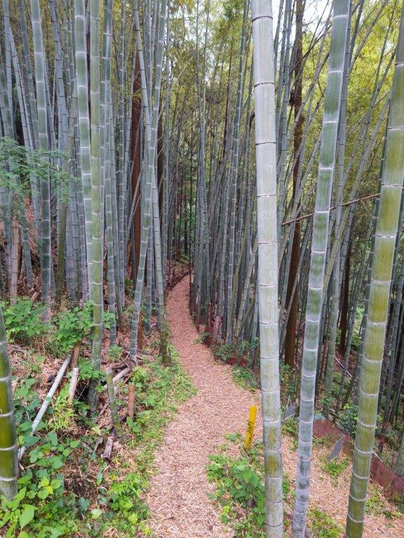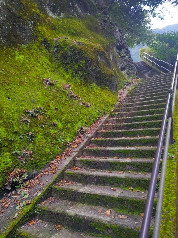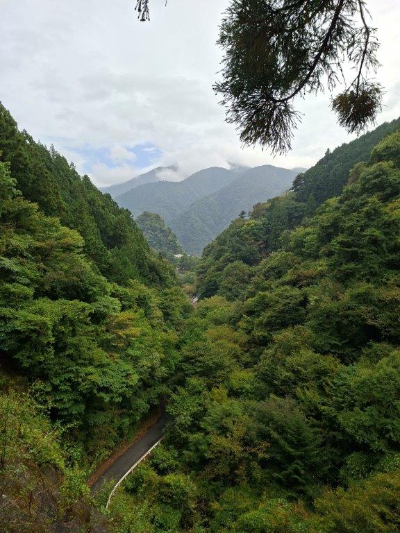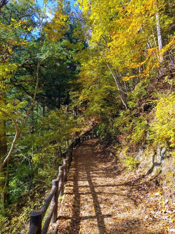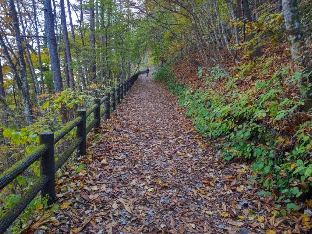 I was stunned by the view of the golden larches covering the foothills, enhanced by the late afternoon sun rays, although Fuji was still stubbornly in the clouds. I made my way to the first terrace, just a few meters away; it was deserted of people, tall pines slightly in the way of the perfect view. It was nearly 3pm, a couple of hours before dark, so I gave up on seeing Japan’s highest mountain and headed down via a paved road, moving to the side once to let the bus pass. Fifteen minutes later, I turned left onto the trail from Suzuran Pass; after descending through dark cedars, I reached a small road the second parking for hikers.