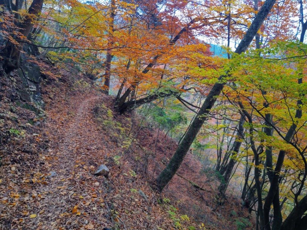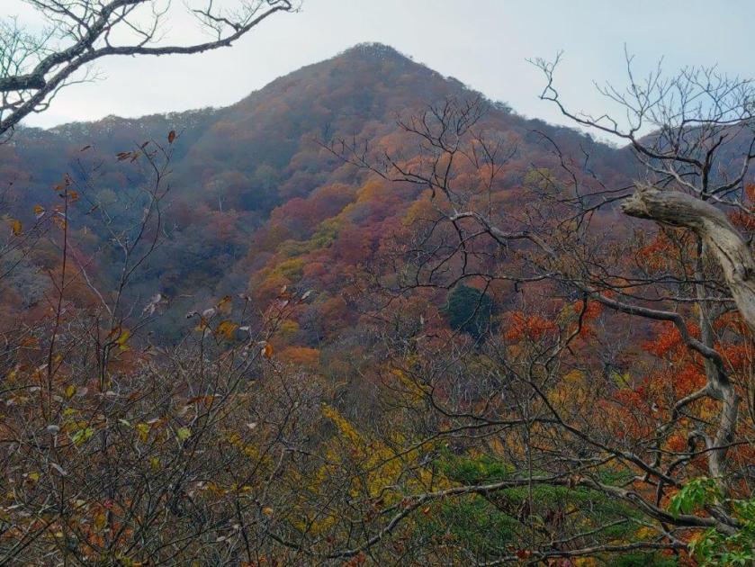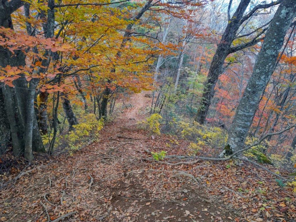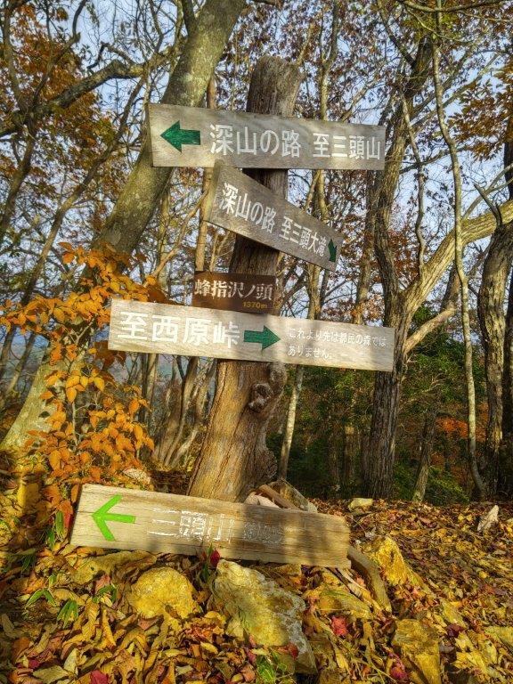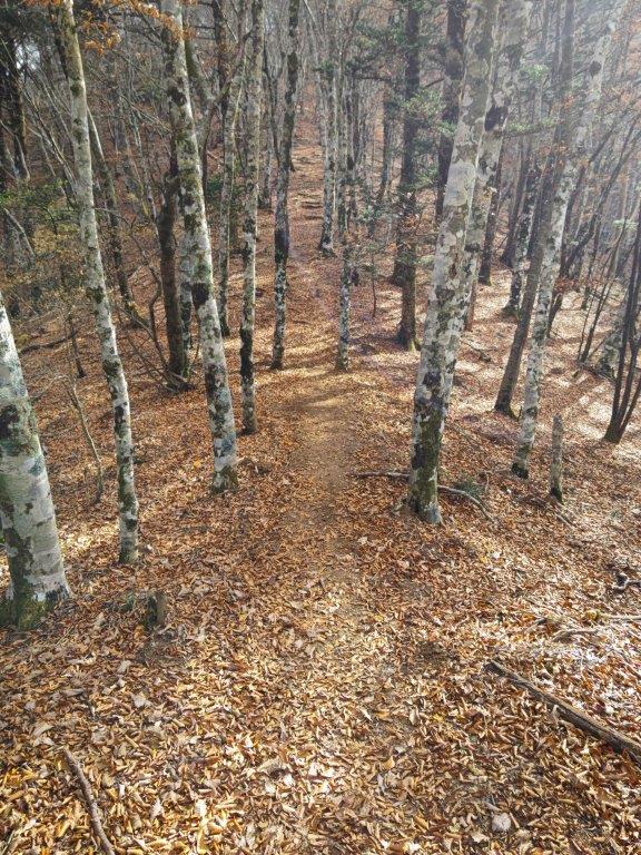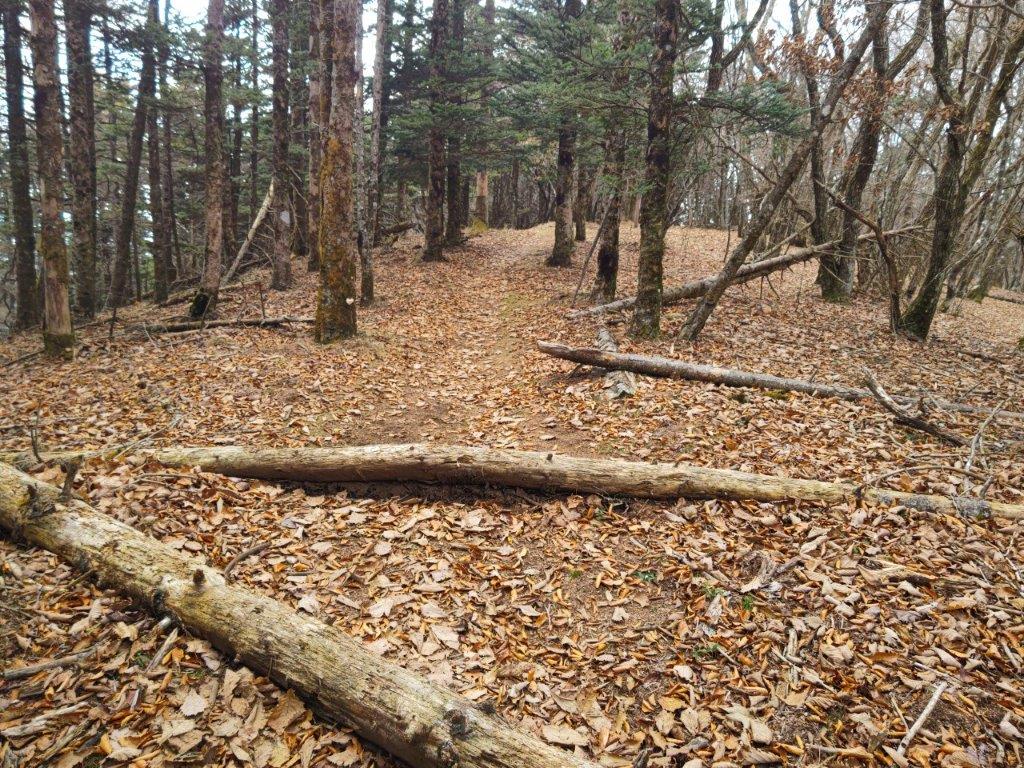 I found myself walking among tall beeches, their tops already bare of leaves, drawing attention to their white trunks. After recrossing the dry riverbed, I reached a paved road where I turned right and soon passed the gated entrance for the road for Fujiyama Twin Terrace, closed to private cars. A little further, I arrived at a sign for today’s mountain, pointing to a faint trail heading up the left side of the dry riverbed. Here, I was glad I could see my position on the Japanwilds digital map since the trail was at times hard to follow. At 1pm, I turned right onto a ridge, the path merging with a signposted trail leading to the summit.