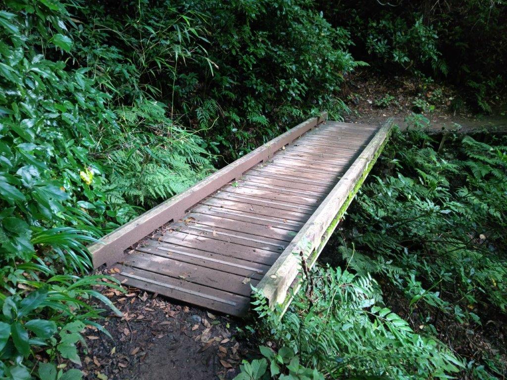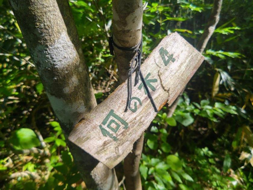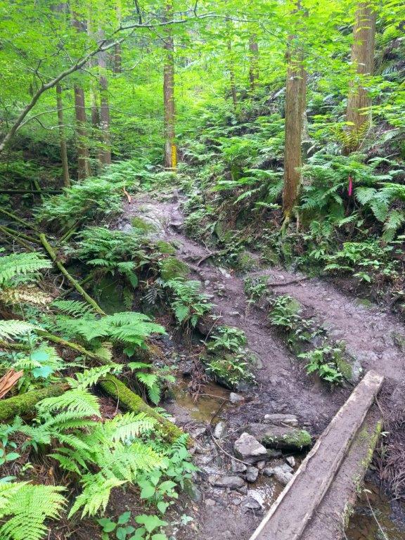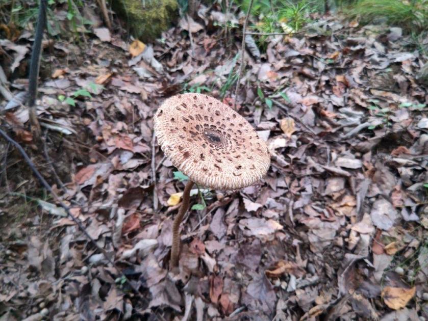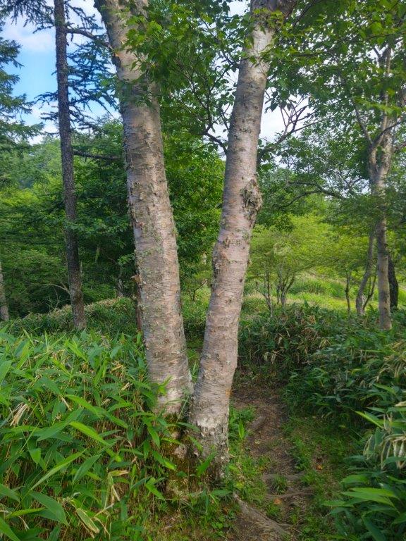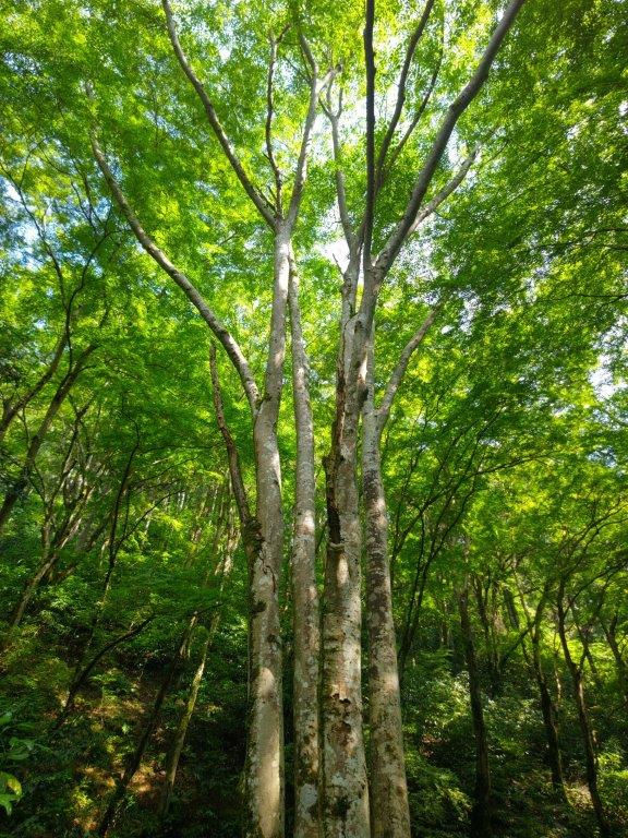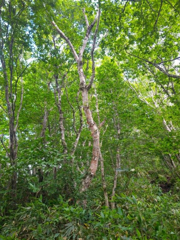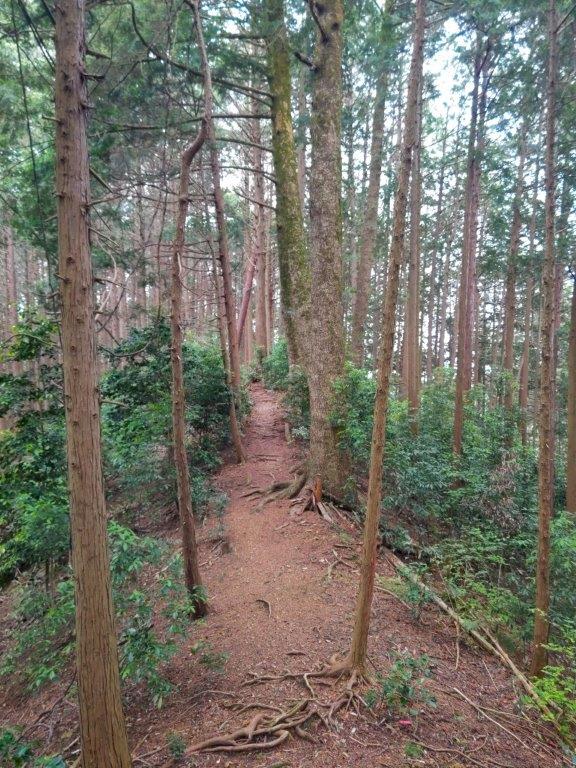 I found myself walking among tall beeches, their tops already bare of leaves, drawing attention to their white trunks. After recrossing the dry riverbed, I reached a paved road where I turned right and soon passed the gated entrance for the road for Fujiyama Twin Terrace, closed to private cars. A little further, I arrived at a sign for today’s mountain, pointing to a faint trail heading up the left side of the dry riverbed. Here, I was glad I could see my position on the Japanwilds digital map since the trail was at times hard to follow. At 1pm, I turned right onto a ridge, the path merging with a signposted trail leading to the summit.