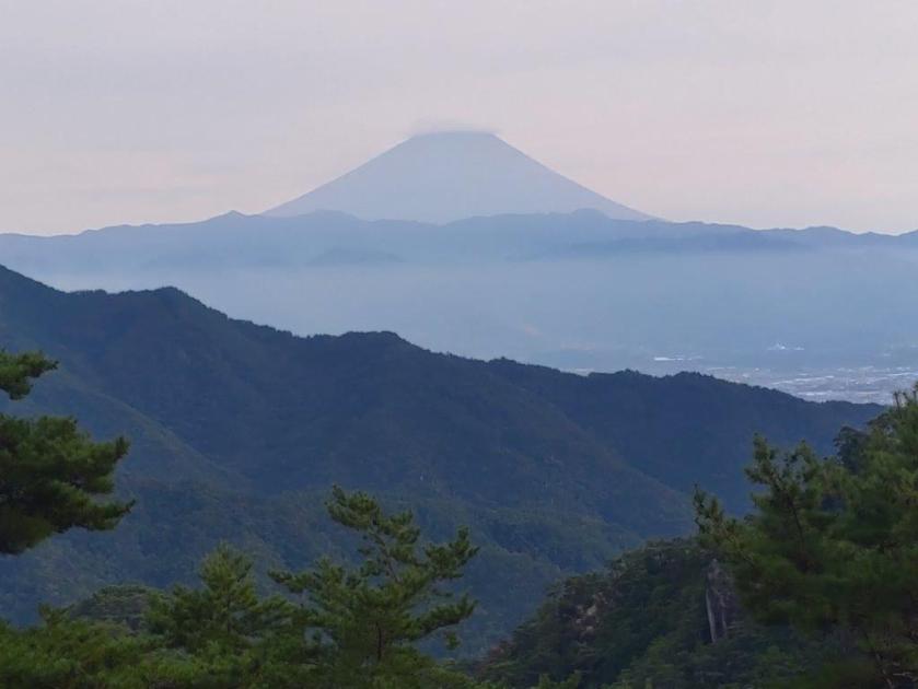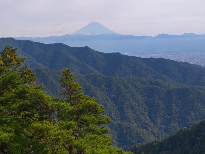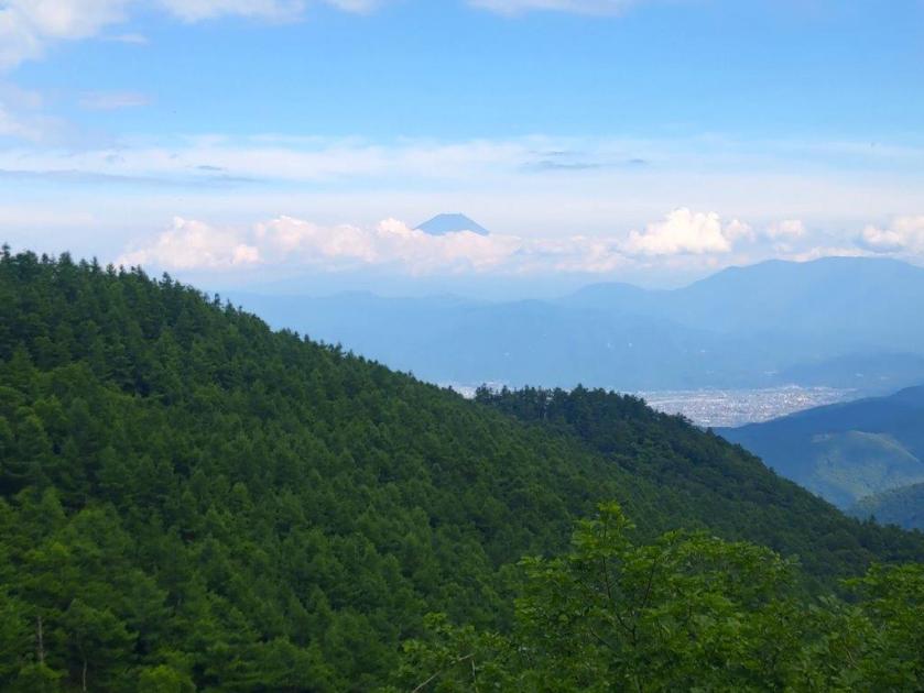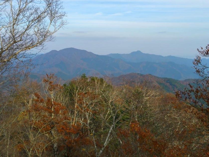 I made good time up the steep trail allowing me to stay warm in the frigid temperatures. I was above 1000 meters and Autumn was already well over, the white beeches providing most of the scenery; a sign indicating told me I was inside a 100 famous forest of Yamanashi. The trail gradually became less steep, giving me a chance to catch my breath without having to take a break. After a couple of turns, I suddenly came upon the summit of Mt Kuro (黒岳 くろだけ kuro-dake meaning “Mt Dark”), the highest peak of the Misaka mountains and a 300 famous mountain of Japan. It was completely in the trees so I dropped my pack and headed for the observation point a few meters to the right, hoping to get a glimpse of Mt Fuji.