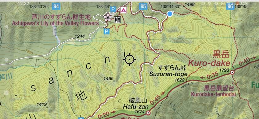 I had climbed these mountains in December 2013 from the Kawaguchiko side. I wanted to hike them again but from the Fuefuki side; I also wanted to try out our Japanwilds Kuro-dake Map for Avenza. Finally, I was interested in riding the free shuttle bus between the Ashigawa Agricultural Products Market “Ogossoya” and the Suzuran-gunseichi Parking Lot; it started running last year to reduce traffic due to the nearby Fujiyama Twin Terrace. However, the bus I had used on my previous trip to the area from Isawa Onsen had been discontinued, so I ended up renting a car from Kofu city instead and skipping the shuttle entirely.