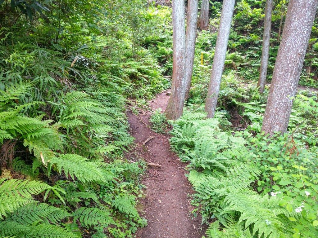 I was surprised to see that thick clouds had rolled in during my ascent, completely hiding Mt Fuji from view. According to the other hikers, I had missed Japan’s iconic volcano by only a few minutes. Looking down, I still had a view of Kawaguchiko lake extending east to west along the base of the mountains. On the right side, I could see Mt Ou and Mt Setto, two other main peaks of the Misaka mountains. I decided to skip my planned lunch break and immediately head to the next summit, in hope that the clouds would have cleared by then. I retraced by steps and headed down a steep path on the west side; beyond Suzuran Pass (すずらん峠), the path became level and easy to walk.