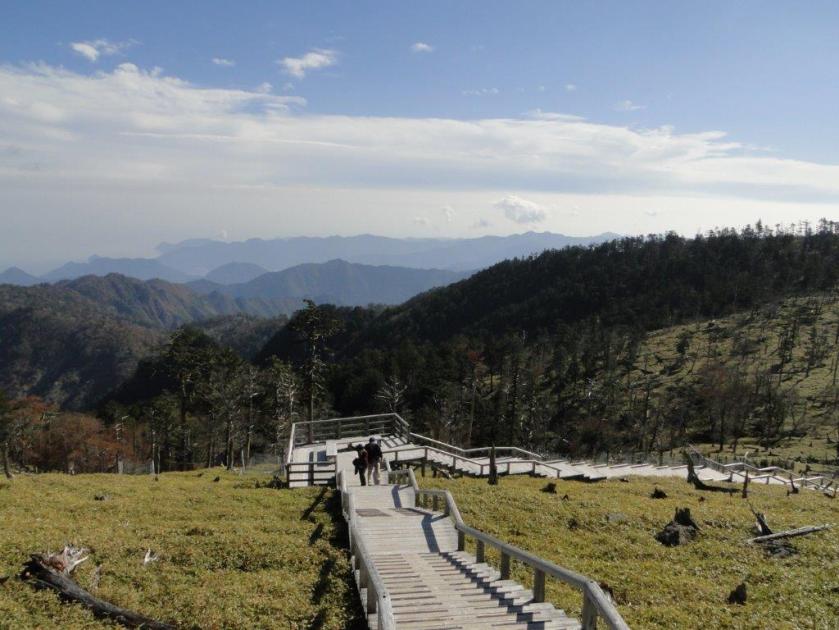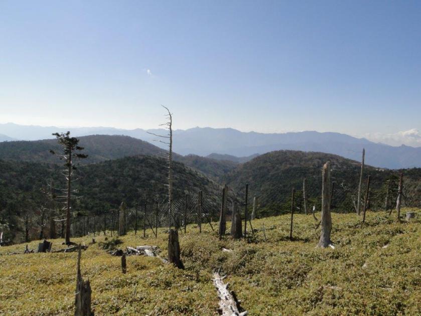 I was finally able to start hiking just after 11am. At 1600m the snow was already getting heavy and wet, and any hiking below that point was bound to be unpleasant. I took the ridge trail leading straight up to the summit. Under the trees, it was enjoyable to hike on the snow, made compact and firm by the footsteps of previous hikers, and on the rocky sections higher up, the snow had completely disappeared from anything in direct sunlight. There was no ice, and crampons weren’t necessary on the ascent although I had light ones in my pack, and several people were using them, mainly for going down. The views of Mt Fuji and the entire range of the South Alps were stunning. I had been to Daibosatsurei before but the views hadn’t been anywhere as great.