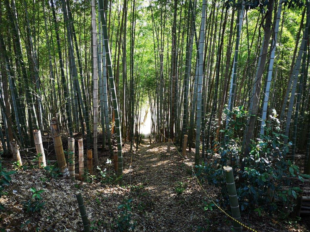 I had some more impressive views of today’s climb, after arriving at a fork in the road. I took the right branch for the West Entrance (西口), which I reached a little after noon. I followed the trail straight up the mountain side and soon reached an open shelter in the middle of the forest. I took a short break and then continued on my way. At 12h30, I reached a turnoff for a natural rock formation, resembling a dolmen, visible through the trees on the right. After circling it and peering through the gap in the middle, I resumed my climb.