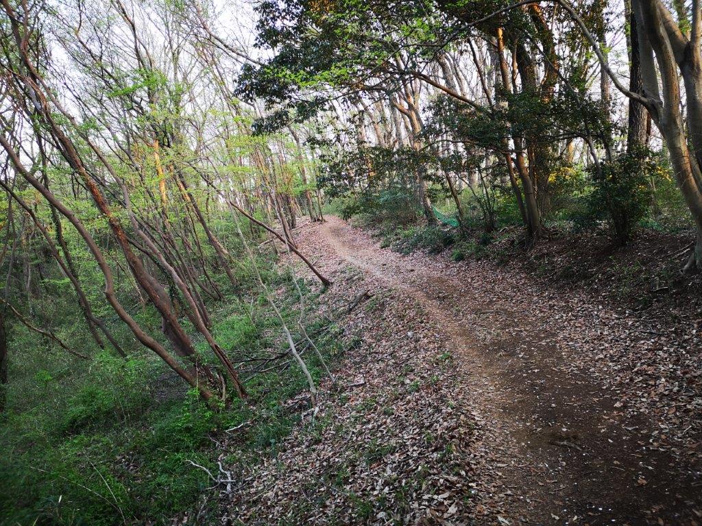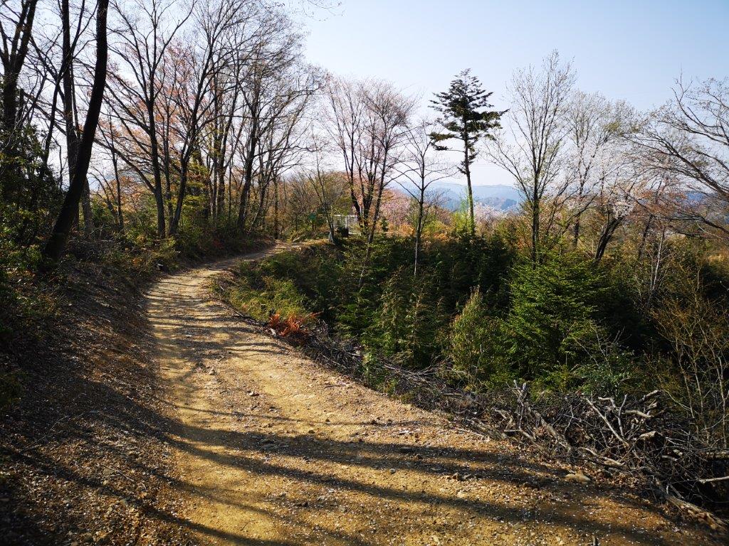 I had also reached the chain and ladder section, called “The Ladder” (梯子); I climbed with care, but near the end I couldn’t advance while keeping three points of contact at all times; after some consideration, I finally found a way, and after fixing it in my mind for the return, continued with the ascent, now in a counter-clockwise direction. A few minutes later, I reached a rocky outcrop from where I had a view south of forested hills. Soon after, I arrived at the flat top of Mt Arikasa (有笠山 ありかさやま arikasayama), a Gunma 100 famous mountain. I couldn’t see anything through the trees, so I headed back almost at once; I got down “The Ladder” safely, and since it was 1h30, found a good place to sit for lunch, at a safe distance from the cliff edge. Afterwards, I continued along the trail, now heading downhill towards the East entrance.