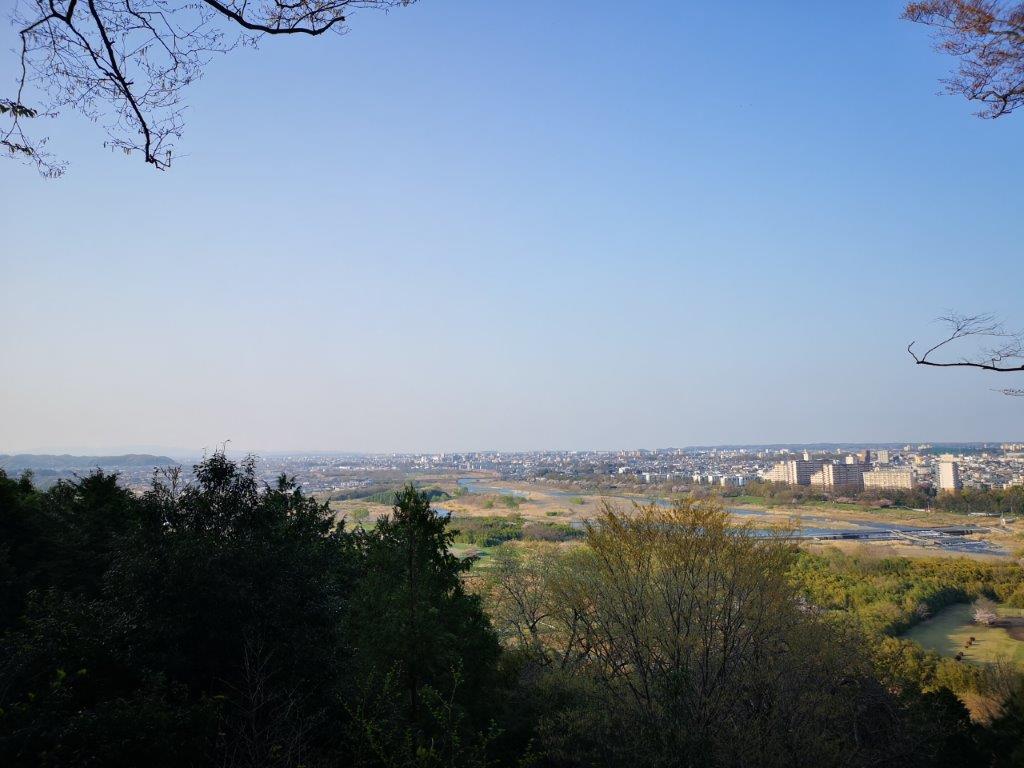 The path turned right under some cliffs, the higher parts hidden by the green canopy of the trees ; here and there, I spotted chains used by rock climbers. At 1pm, I arrived at the East Entrance (東口) trail junction and the start of the roundtrip for the summit; I followed the path as it wound clockwise around the steep summit and passed a funny sign informing me that I was at an elevation of 888 meters, read as “Hahaha” in Japanese (ハハハ). Very soon, I was walking through a rocky area with views to the west through the trees; looking down, I realised I was at the edge of a cliff.