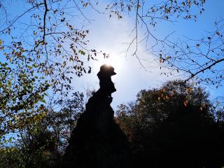 Half an hour later, I reached a viewpoint with a dozen benches, to accommodate the weekend crowds. I could see the triangular summit of Mt Oyama, as well as the urban spread to the North. After a short break, I set off for Hinata-Yakushi Temple 日向薬師寺, in the opposite direction of the trail for Mt Oyama, heading down the mountain. Some workers were doing maintenance on the trail, due to be completed today according to a sign I saw lower down. I had some good views Southwards of the Izu peninsula. Past a rather large jizo statue, which I first mistook for a person, the path turned sharply off the ridge and went downhill via a series of switchbacks.