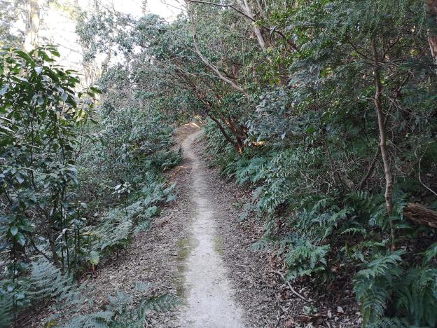 Around 1h30, I emerged onto a road, but I soon turned left onto a small trail to Johotsuganji Temple. At this point, I had left the Fureai no Michi. After about ten minutes, I arrived at a small cave at the base of a cliff. It contained some Buddhist statues, and from the croaks I was hearing, some frogs as well! The trail continued up the mountain, along a ridge crisscrossed with tree roots, making it a little difficult to follow. Before reaching the highest point, the path turned right and followed the side of the valley. Here the path showed signs of maintenance, and was much easier to follow. Around 2pm I reached an old bench, a good place for a break and a late lunch. There was no view, but the surrounding was very peaceful save for the chirping of birds. The path continued, along a level ridge extending northwards.