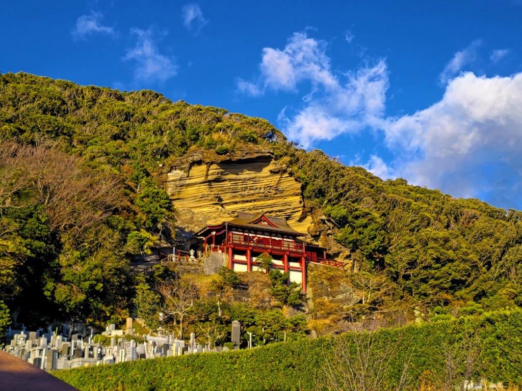 Fortunately, two of the most interesting sights can be reached on foot from Nakofunakata Station, one stop before Tateyama. Gake-Kannon (literally, “Cliff Kannon), also known as Daifuku-ji, is a temple, built under a red hued cliff, especially striking around sunset. It’s worth climbing one of the several staircases up to the small temple building perched directly under the cliff to see the view of the bay from the front viewing platform.
