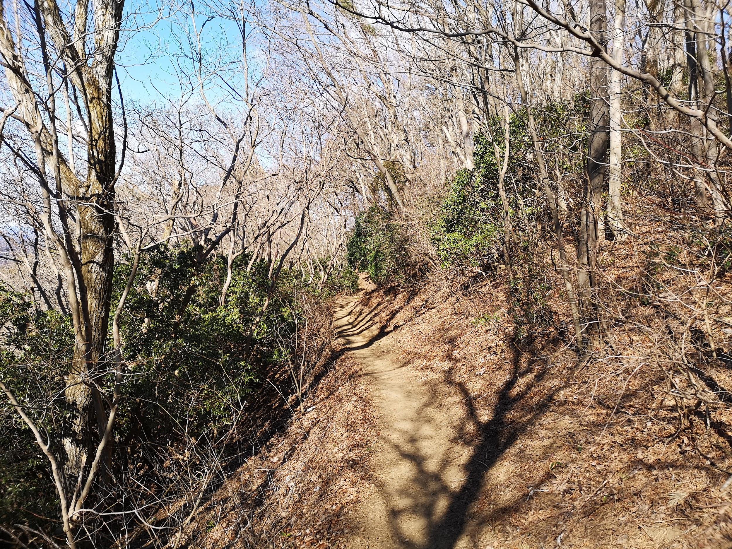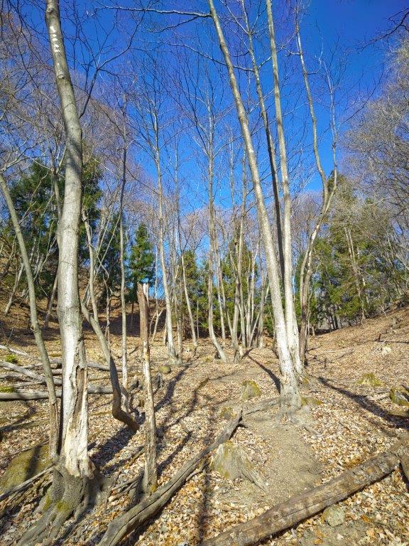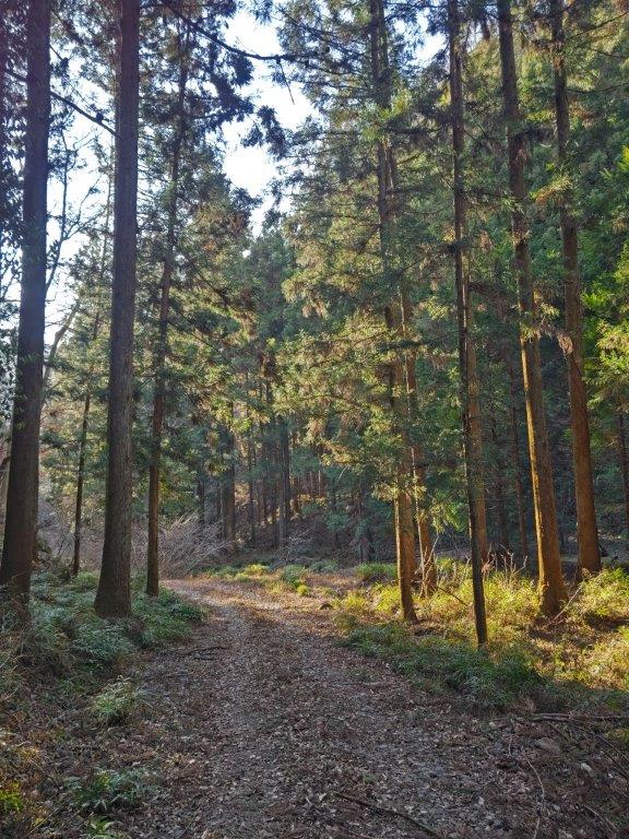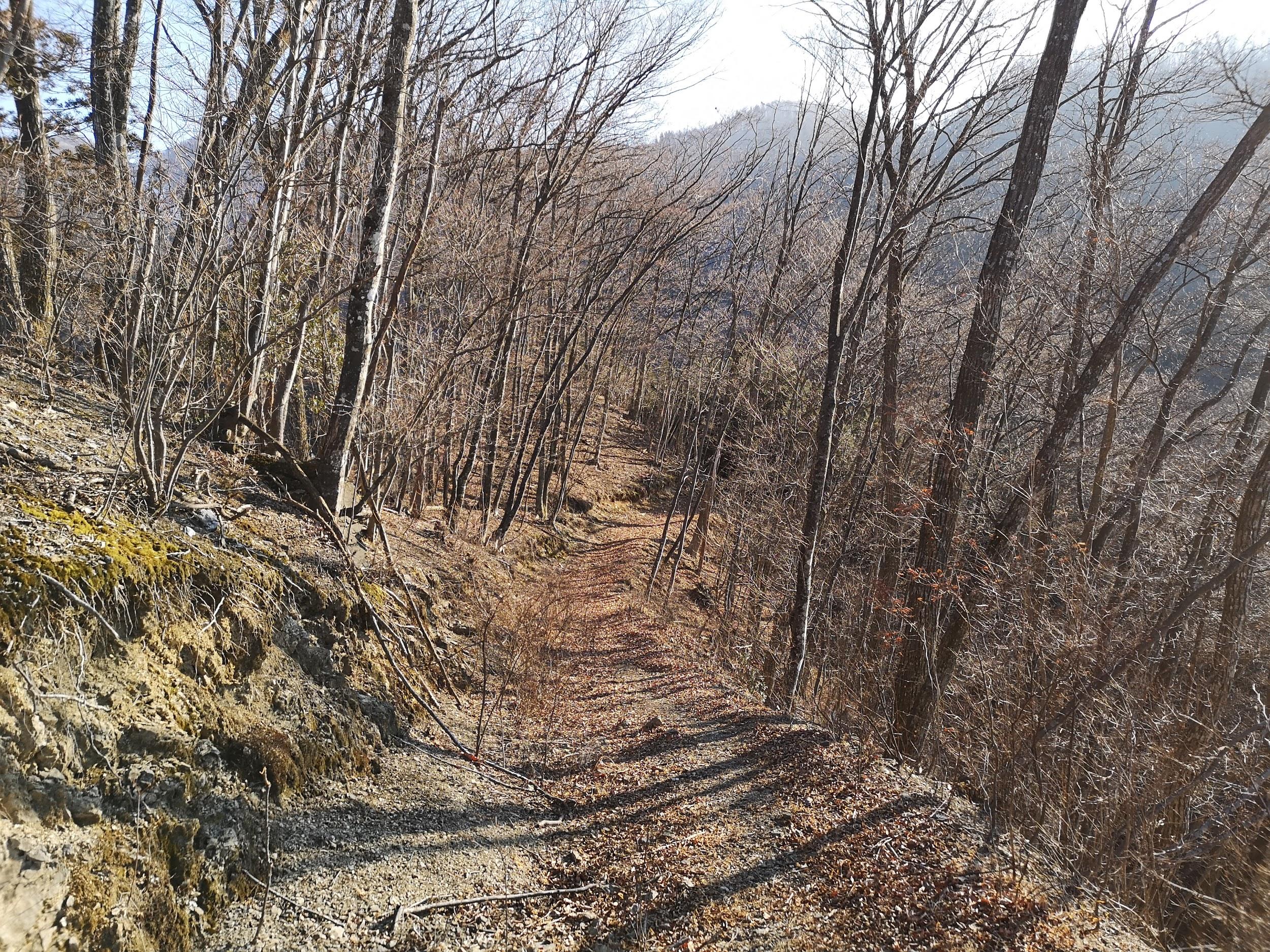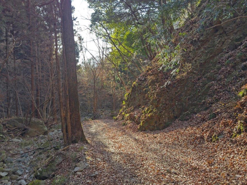 I rode the shinkansen to Takasaki on a sunny, cloudless day and then transferred to the Joshin line for Shimonita, arriving there a little after 10am. It took about ten minutes by taxi to reach the trail entrance, and after getting ready, I set off along a forest road through the cedars. I soon passed the end of the forest road, and by 11am, was walking up a rocky valley; I was finally starting to warm up, thanks to the sun, shining through the bare trees.