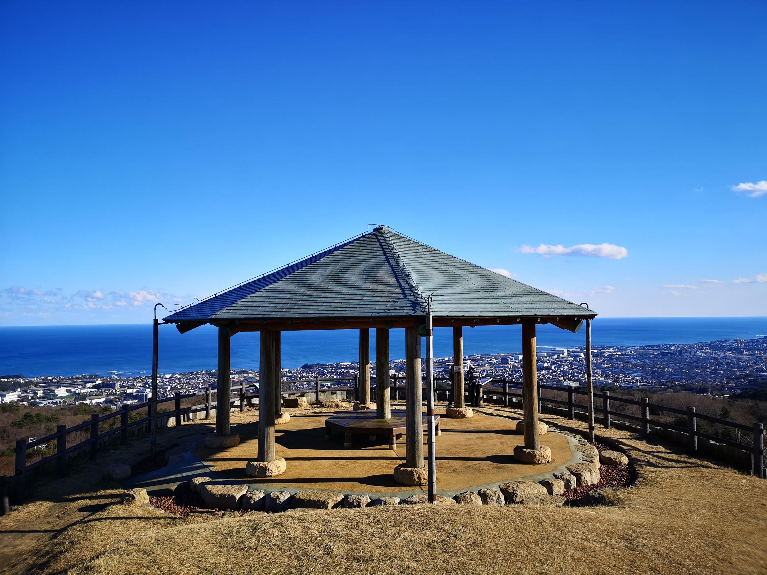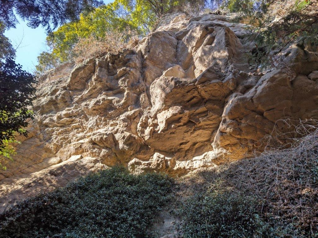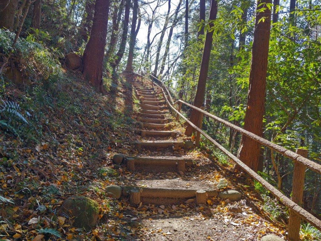 I was extra careful to check for hidden holes, the path being covered in a layer of dead leaves. At 11h30, I reached Mi-no-Taki waterfall, barely a trickle at this time of year. It was also the trickiest part of the hike, requiring a quick scramble up a rocky face, fitted with a rope for safety. Next, a short, steep climb brought me to an intersection at the top of the valley. Here, I dropped my pack and headed left for the short roundtrip to the first viewpoint.