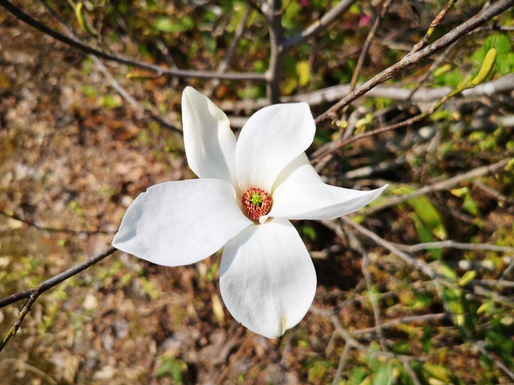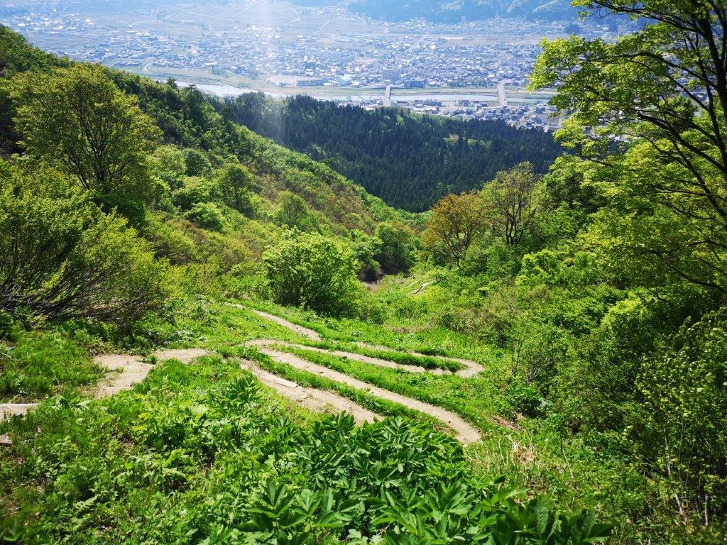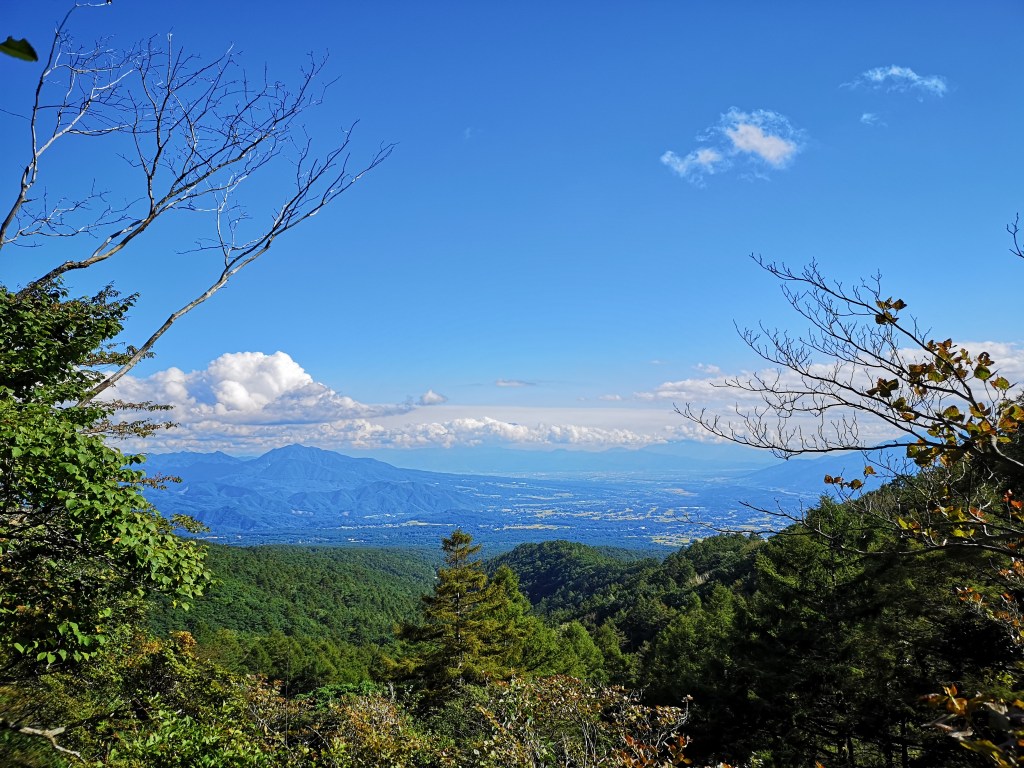 I followed a narrow ridge passing by the base of a rocky outcrop, and after a few minutes, reached a level, rocky ledge, opposite “Jjji-iwa Baba-iwa” (じじ岩ばば岩) meaning “Old man rock old woman rock”), two impressive stone pillars perched at the end of the ridge. Turning around, I had a bird’s-eye view of a deep valley, with flat-topped Mt Arafune in the background. Since it was nearly noon, I found a spot to sit and had an early lunch. After enjoying the view, I made my way back to the intersection and continued along the right branch.