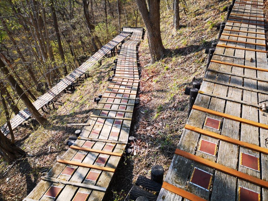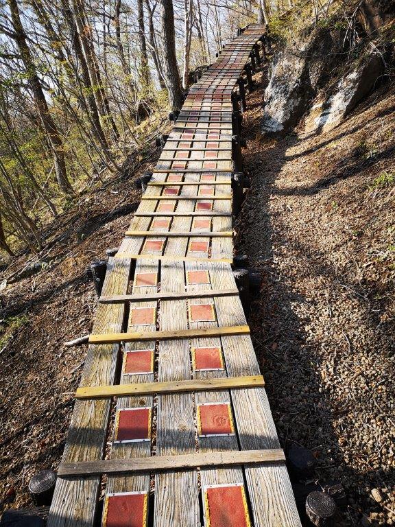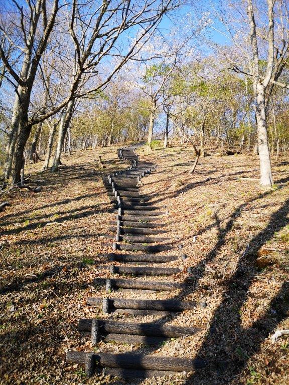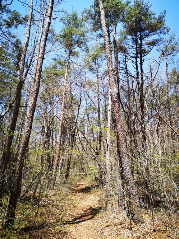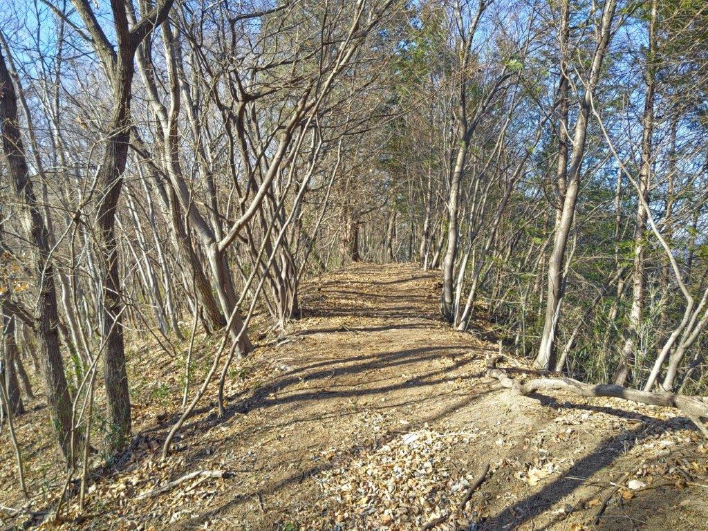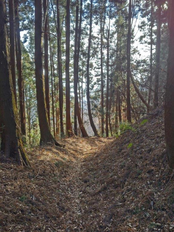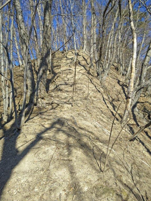 I was surprised by how dry everything was, dust flying up from the trail at every gust of wind. After some more climbing along the narrow, twisting ridgeline, I reached the summit of Mt Mido (御堂山 みどうやま mido-yama), a Gunma 100-famous mountain, a little before 1am. It was mostly in the trees, but I could make out the jagged summit of Mt Myogi, as well as the snowy top of Mt Asama, both on the north side. After a short break, I retraced my steps to a turn-off for the nearby “Jitoba-ura-tenbosho”, the rear viewpoint of the stone pillars.