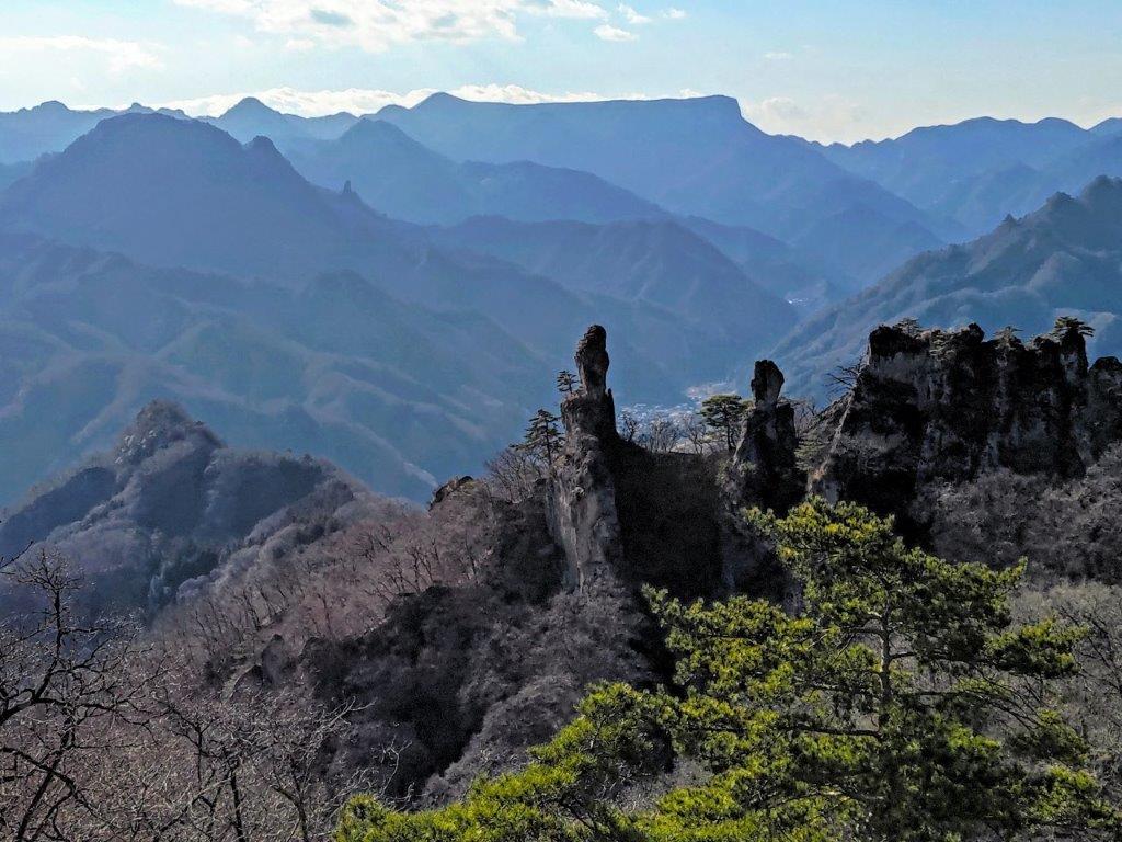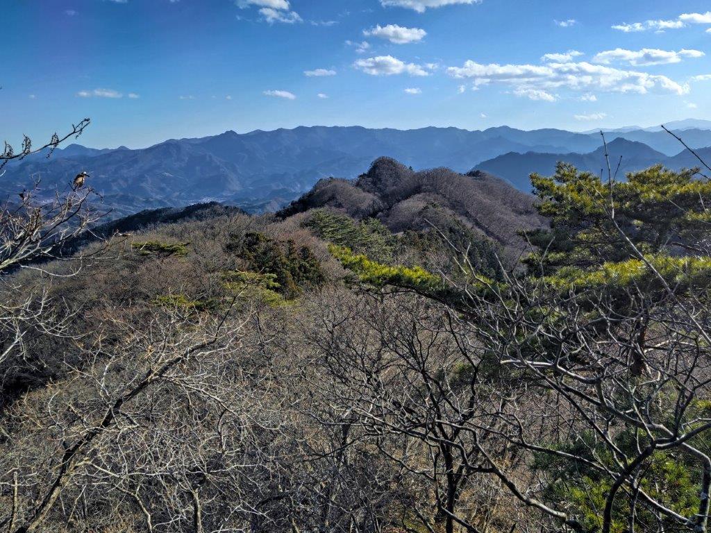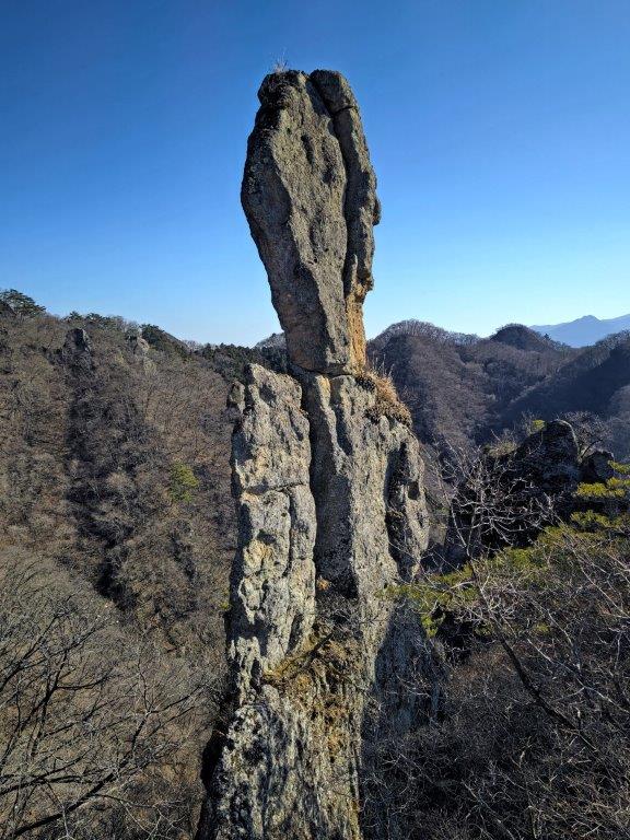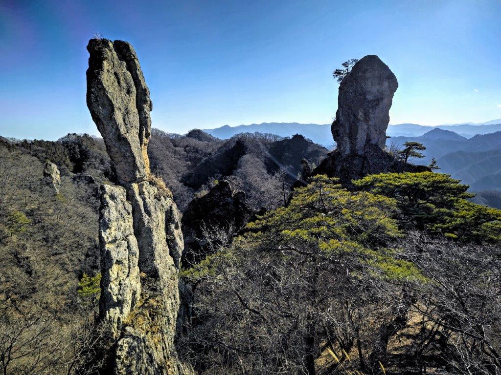 After my Annaka to Annaka hike, I needed to find another mountain I could climb in the winter using the Tokyo Wide Pass. I decided to visit the Nishi-Joshu area, since my last hike there was nearly 3 years ago. I found a suitable peak in my mountains of Gunma guidebook, low enough to be still free of snow, and short enough so I could catch the mid-afternoon bus back. To give myself some extra time, I would get to Shimonita station an hour before the morning bus and take a taxi to the trailhead. Although the hike went up and down the same path, I could check out a couple of viewpoints on the way, as well as this peak’s claim to fame: two tall rock pillars perched on the mountain side. I was looking forward to revisiting Nishi-Joshu after a long interval and getting some new views of the area.